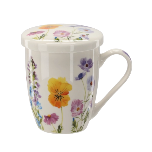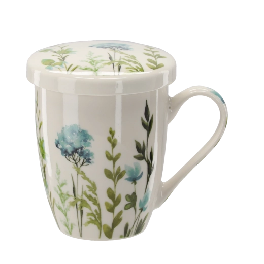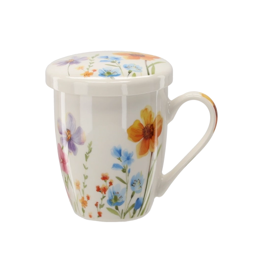 Cană stilată din porțelan, cu volum de 340 ml și sită practică din inox, ideală pentru prepararea ceaiurilor vrac și a infuziilor din plante. Sita integrată permite infuzarea comodă fără ustensile suplimentare, iar capacul din porțelan menține băutura caldă mai mult timp și protejată. Designul floral adaugă eleganță oricărei mese, iar mânerul ergonomic asigură o prindere confortabilă în utilizarea de zi cu zi.