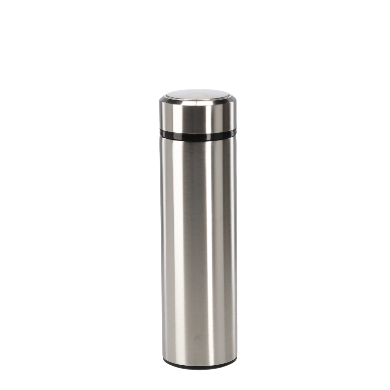 Designul minimalist în culoarea naturală a oțelului inoxidabil, fără acoperire de suprafață, este completat de plastic PP negru pentru o prindere comodă. Forma suplă, cu diametrul de 6,5 cm, se potrivește perfect în mână și în suporturile pentru pahare din mașină. Datorită greutății reduse de 288 g, cana termică este ideală pentru utilizare zilnică, la birou și în excursii.