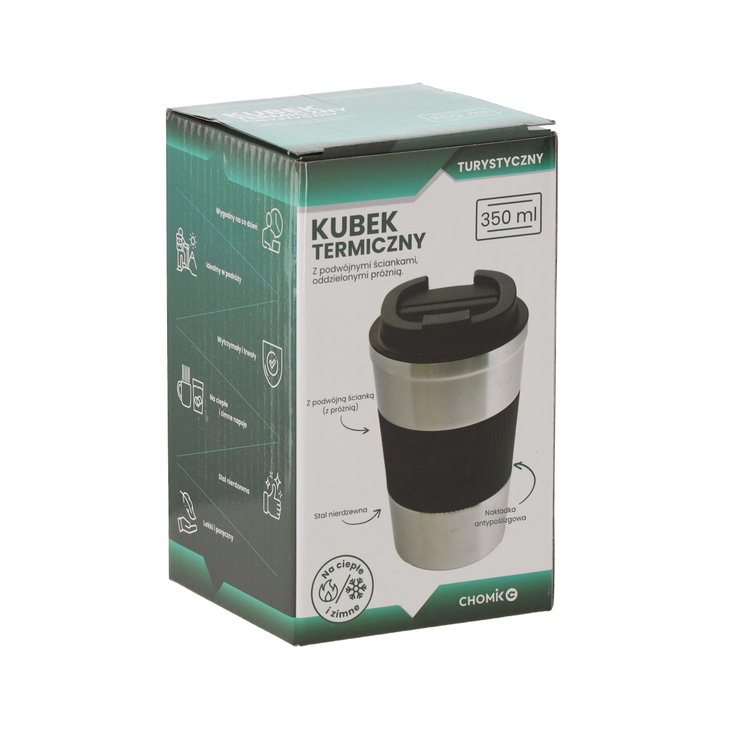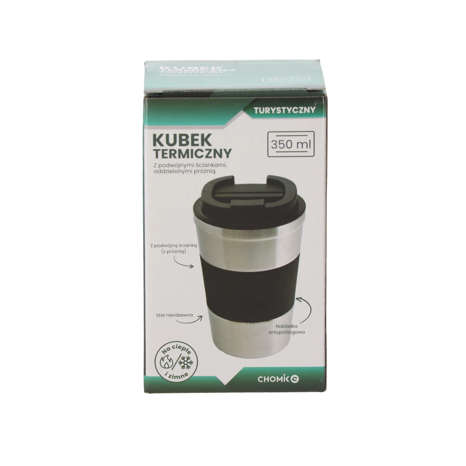 Cană termică practică, cu volum de 350 ml, din oțel inoxidabil de calitate, cu construcție cu vid, menține băutura caldă sau rece până la 4 ore. Are manșon din silicon antiderapant pentru prindere sigură, capac înșurubabil din PP rezistent și este potrivită pentru mașina de spălat vase. Suprafața elegantă în culoarea naturală a oțelului inoxidabil se potrivește la birou, în mașină sau în excursii.