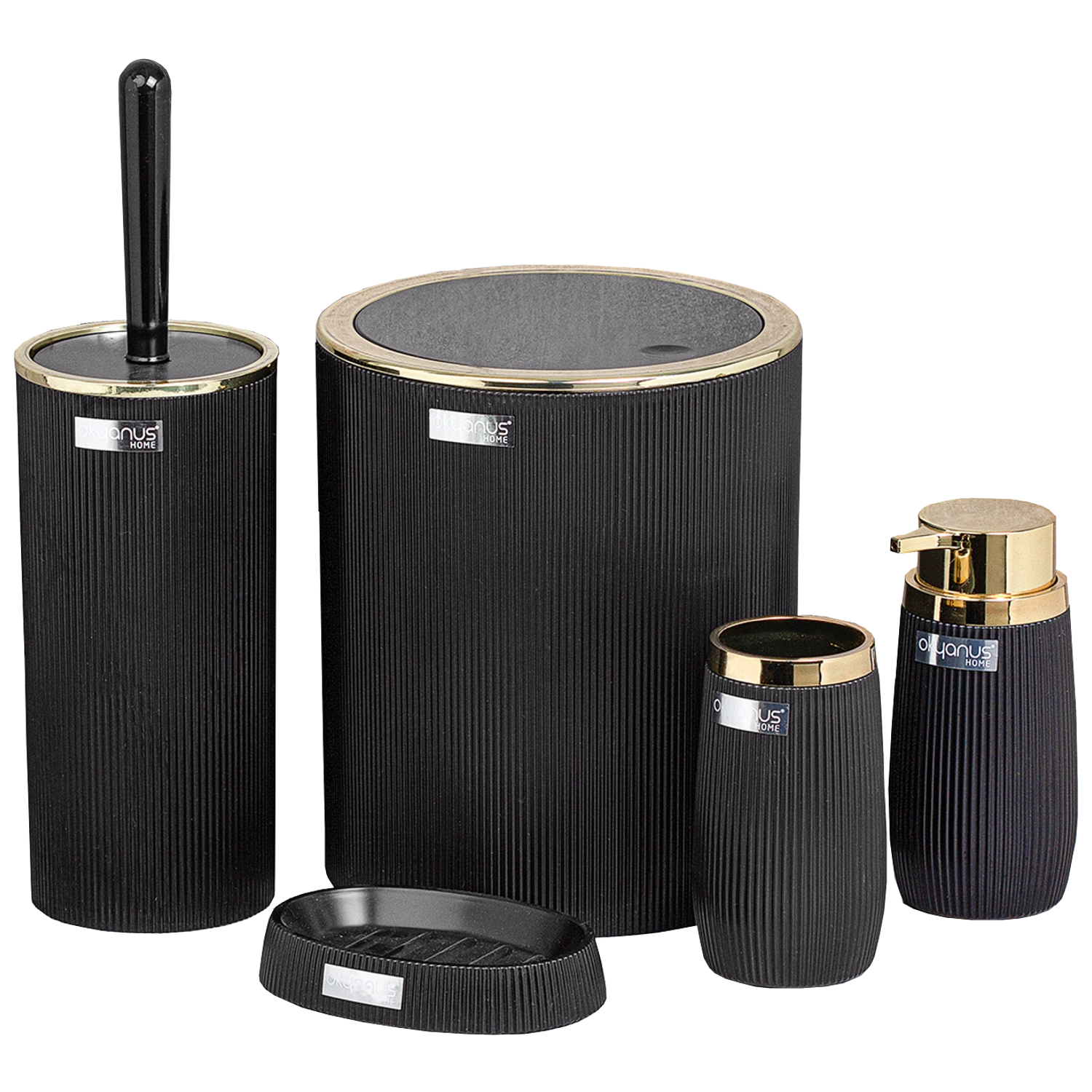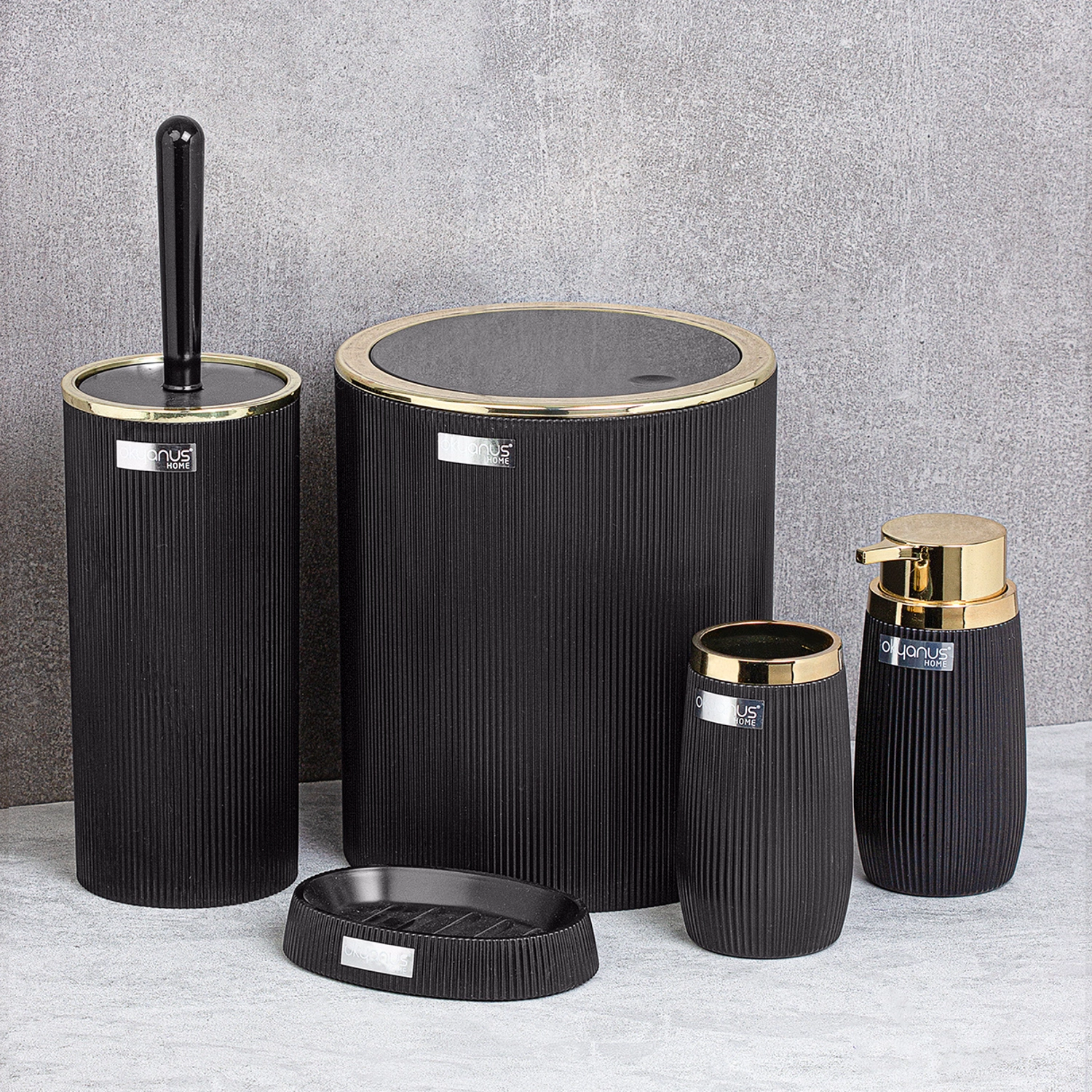 Set rotund elegant pentru baie, din plastic rezistent, în combinația negru și auriu, care oferă băii tale un aspect luxos și funcționalitate. Pachetul conține 5 accesorii de bază pentru igiena zilnică: coș de gunoi, perie pentru toaletă, dozator de săpun, pahar pentru periuță și săpunieră. Întreținere ușoară, materiale ușoare și detalii stilate pentru un aspect perfect asortat.