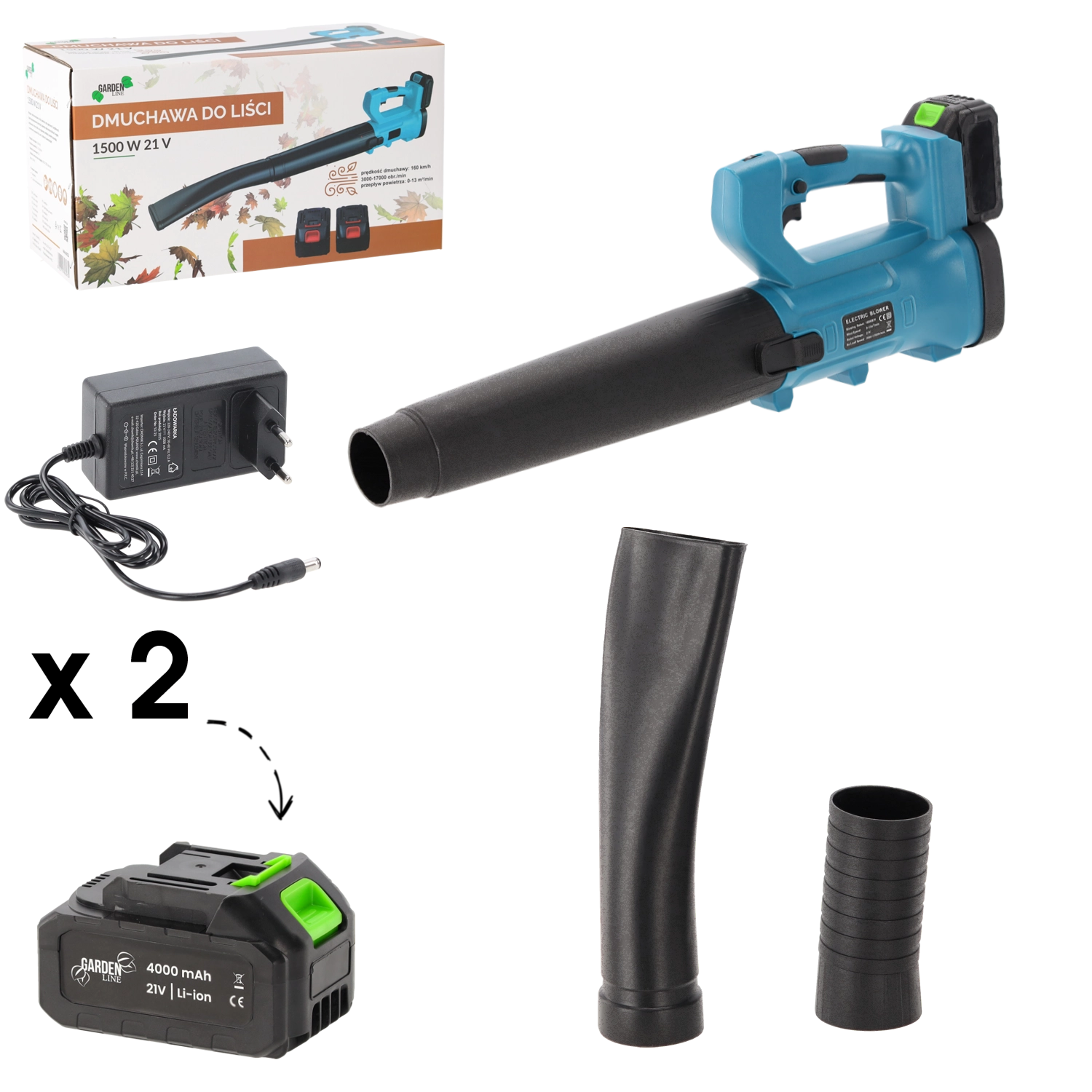 - Suflantă, 2 acumulatori, încărcător, set de duze