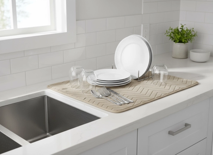 Păstrați chiuveta și blatul din bucătărie uscate și ordonate. Covorașul de uscare din 100% microfibră de poliester absoarbe rapid umiditatea și oferă o suprafață moale și sigură pentru așezarea vaselor spălate. Este o alegere excelentă pentru utilizarea zilnică, în special pentru pahare fragile și porțelan fin.