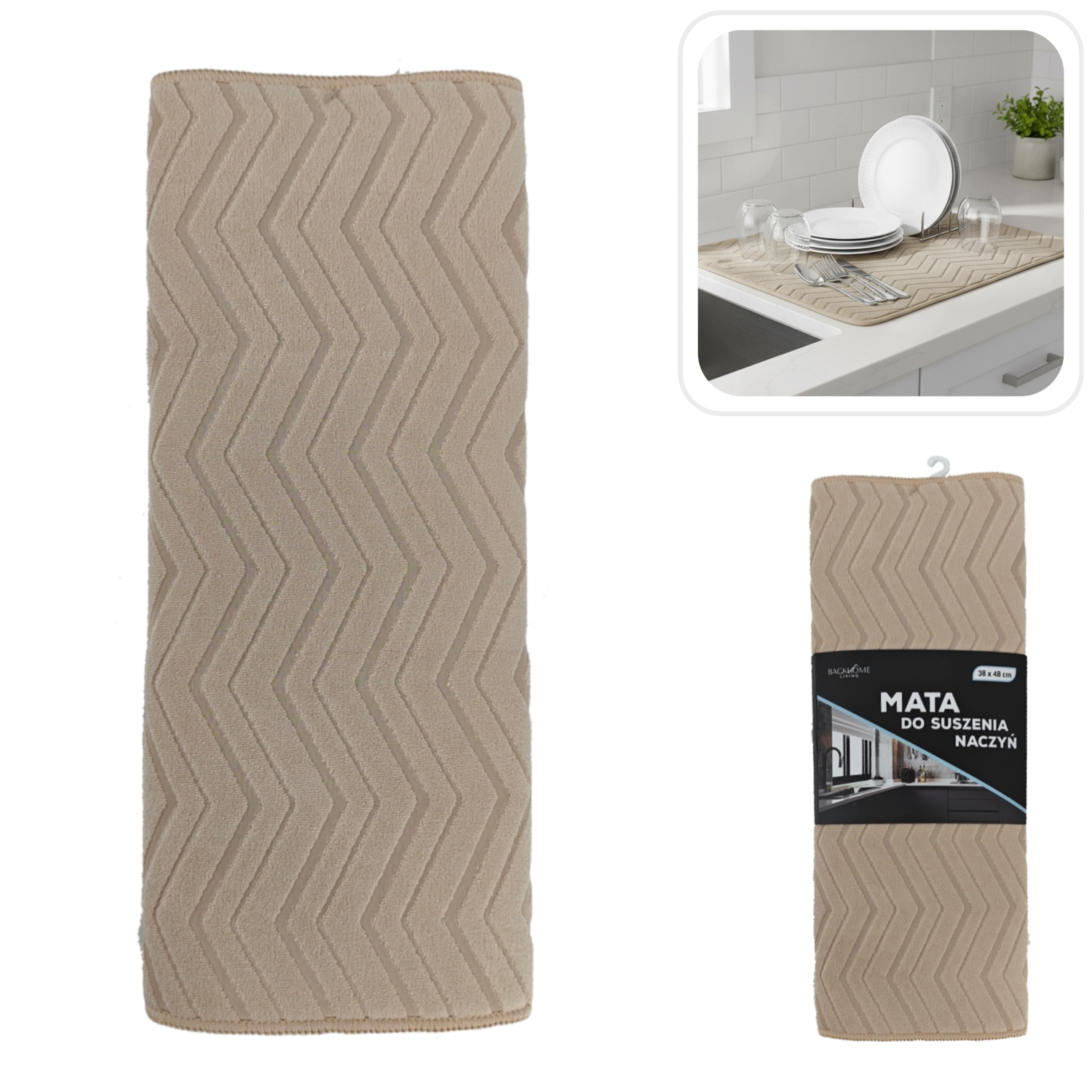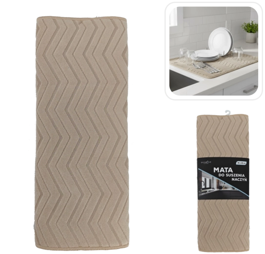 Covoraș practic de uscare cu dimensiunile 38 × 48 cm, din microfibră de poliester de calitate, care accelerează uscarea vaselor și protejează blatul de lucru de picături. Datorită capacității ridicate de absorbție și texturii moi, este ideal pentru pahare fragile și porțelan, minimizând zgârieturile și riscul de spargere. Întreținere ușoară – covorașul poate fi spălat în mașina de spălat la 30 °C și, datorită dimensiunilor compacte, se pliază ușor după utilizare.