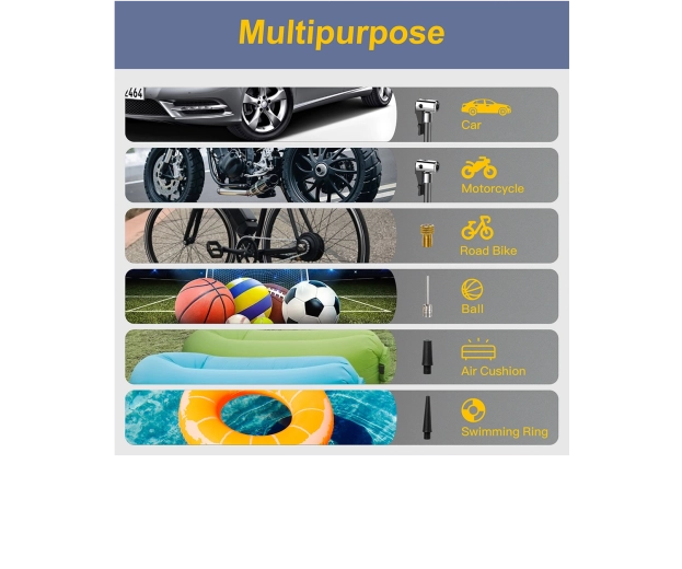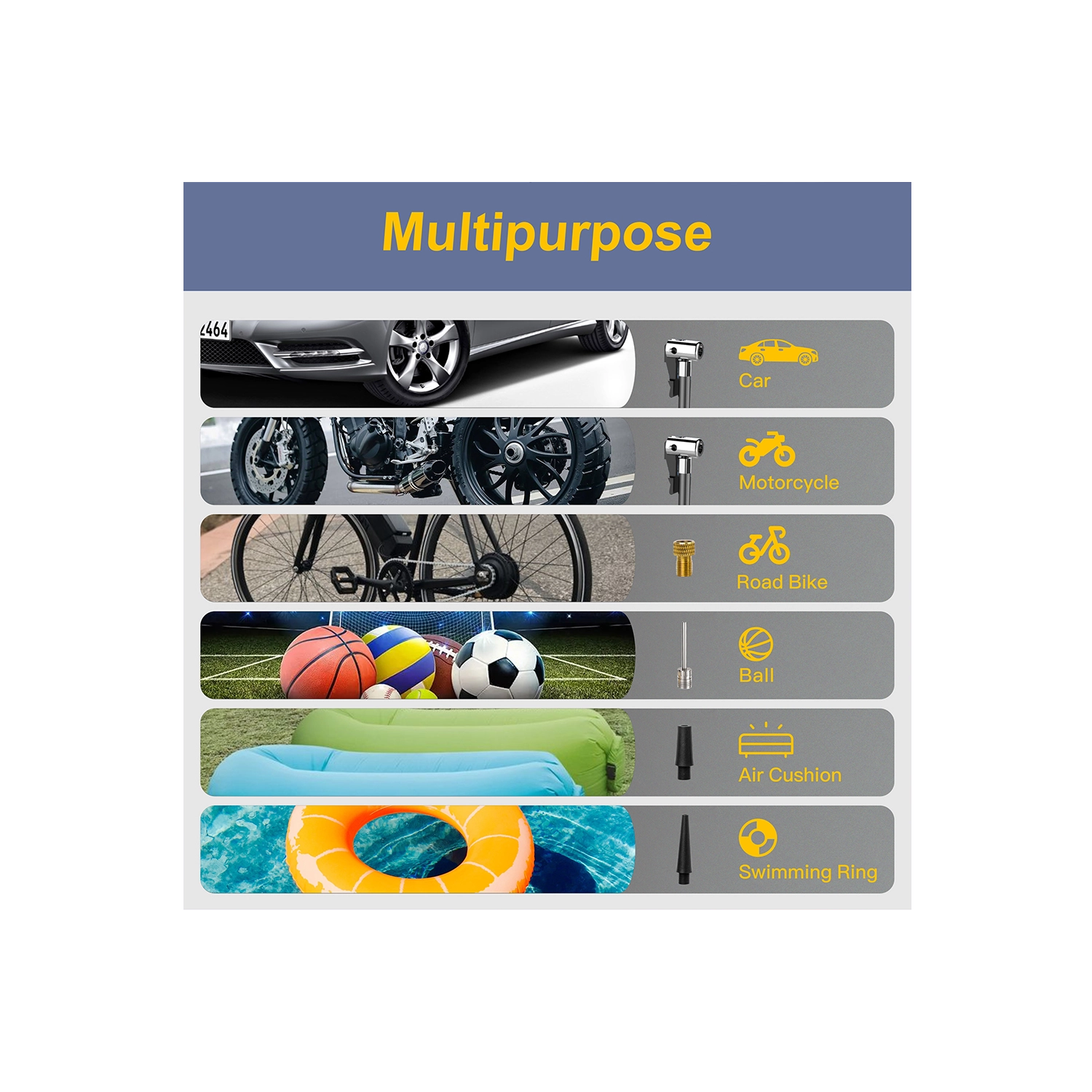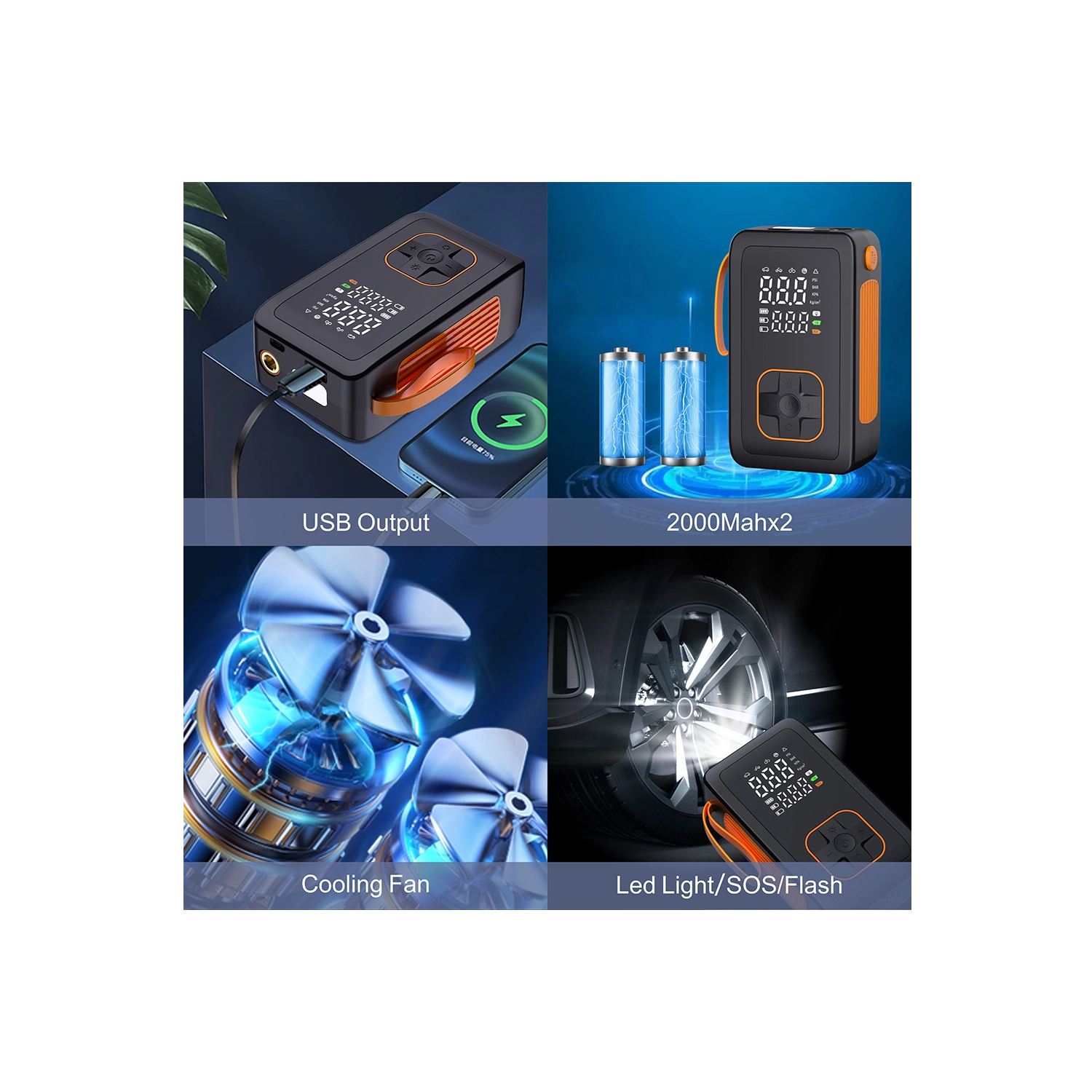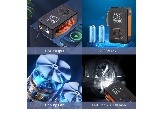 Alegeți dintre 5 moduri rapide (auto, motocicletă, bicicletă, minge sportivă, manual) și 4 unități de presiune (PSI, KPA, BAR, KG/CM²). Modul manual cu memorie reține ultima setare. Ventilatorul de răcire integrat prelungește durata de viață, iar valva de purjare facilitează reglajul fin al presiunii. Lanterna LED cu 3 moduri (standard, SOS, intermitent) crește siguranța la lucru pe întuneric.
