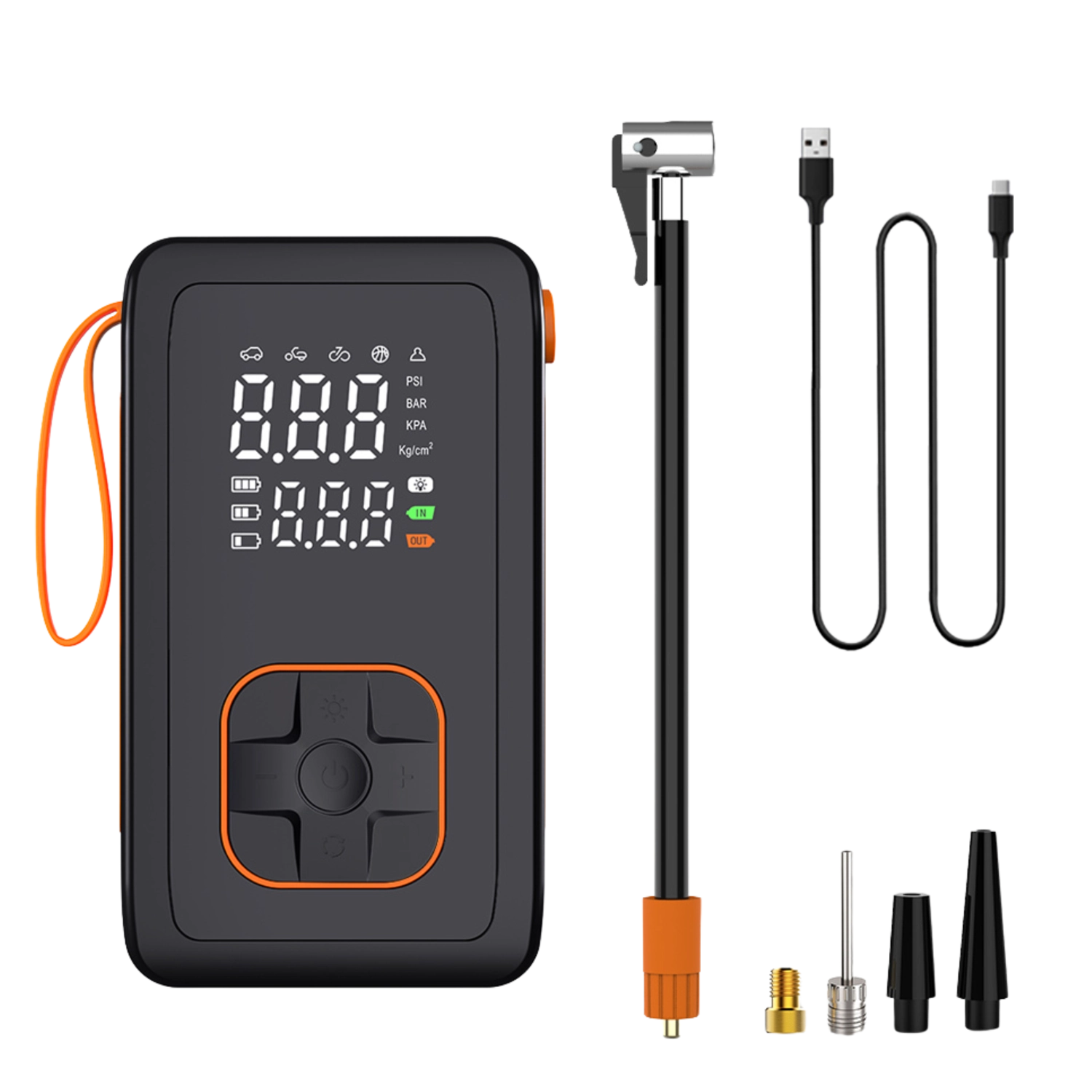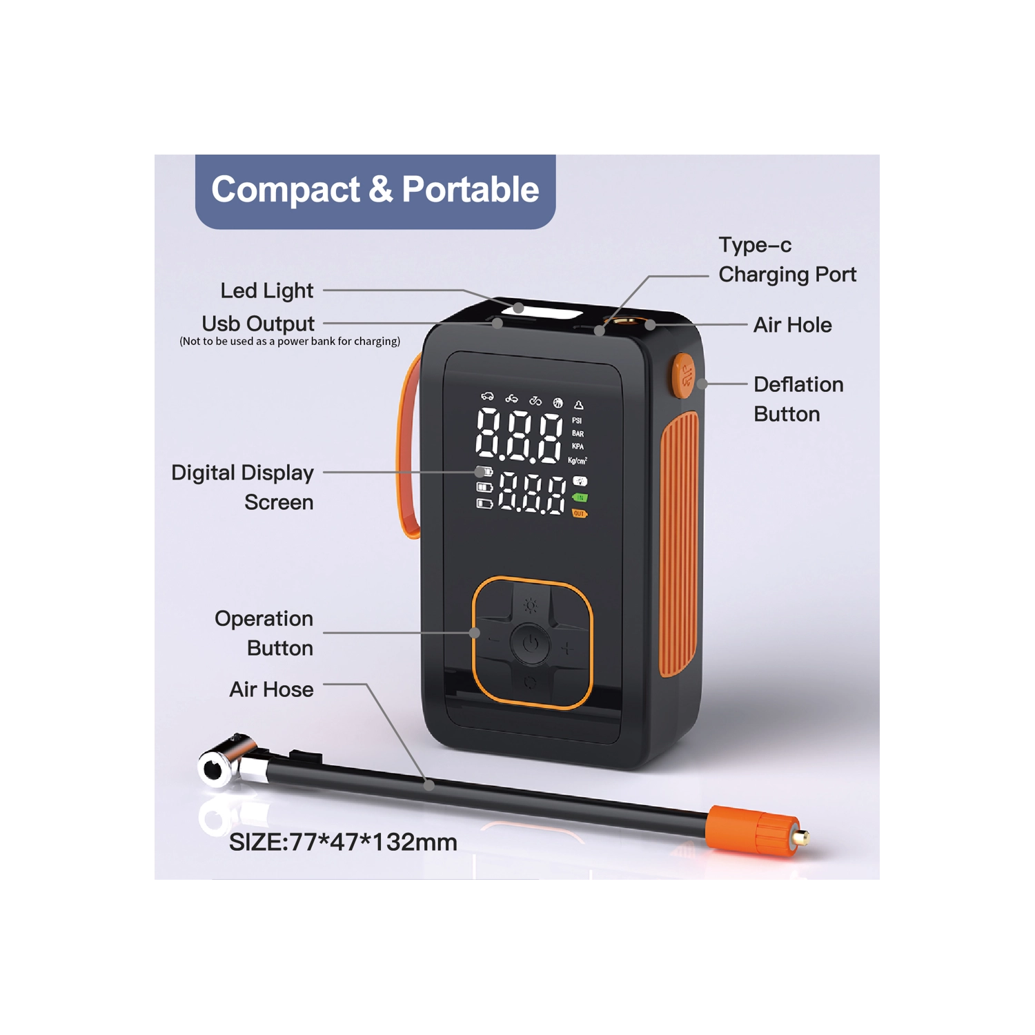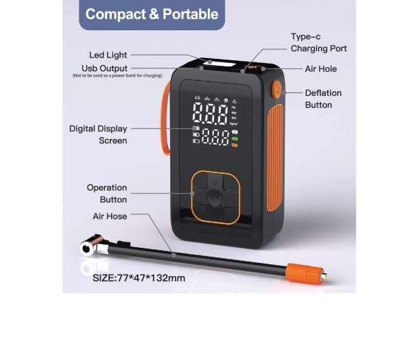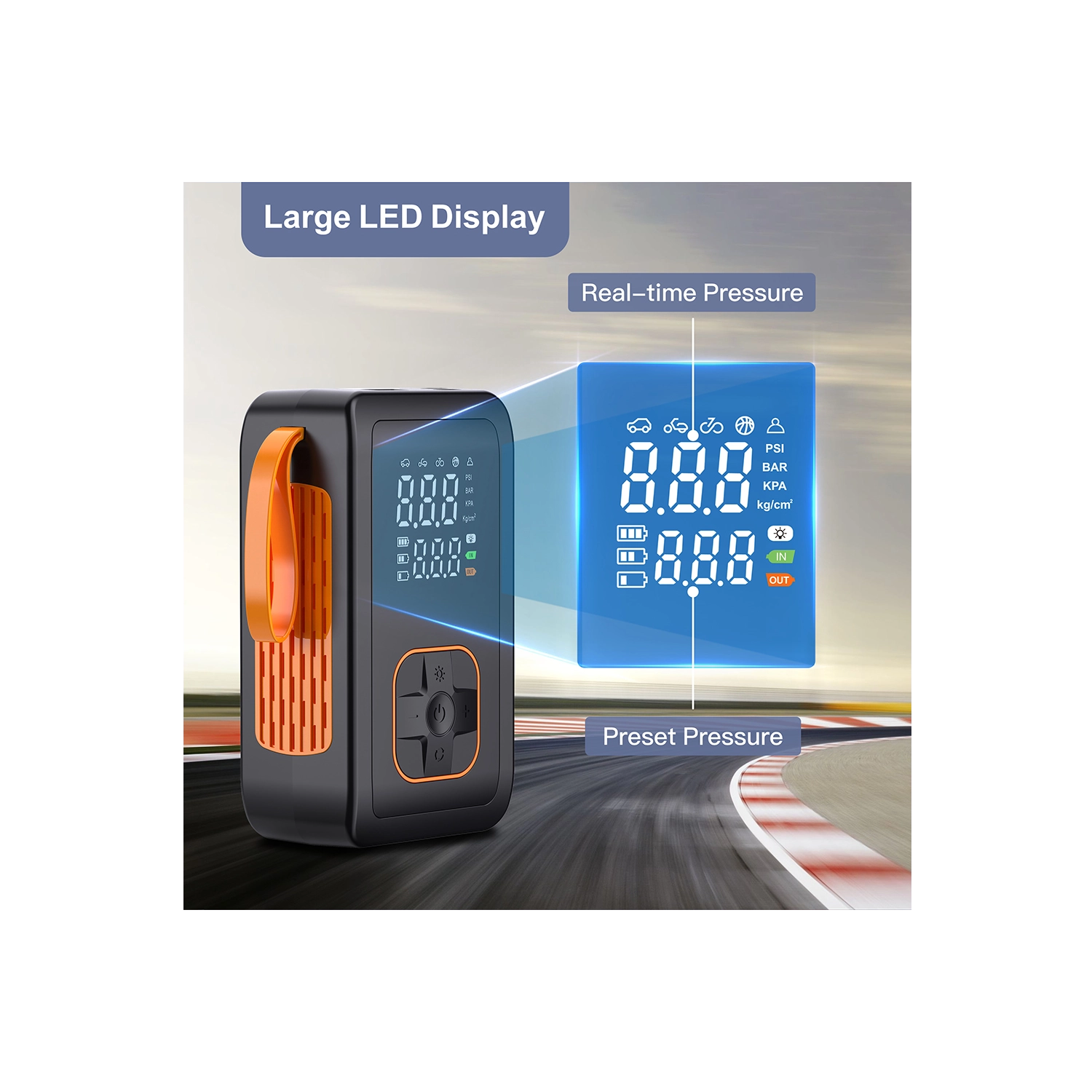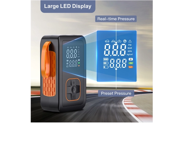 Această pompă portabilă de 7,4 V cu acumulator combină umflare performantă până la 150 PSI / 10,3 BAR cu funcția practică de powerbank. Datorită dimensiunilor compacte și mânerului comod este ideală pentru călătorii, mașină și atelier. Ecranul digital dual afișează atât valoarea setată, cât și pe cea actuală a presiunii, în timp ce oprirea automată oprește umflarea după atingerea țintei.