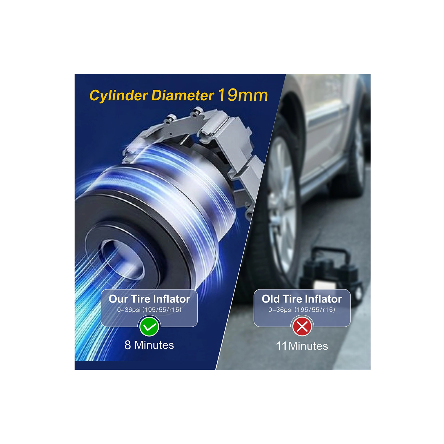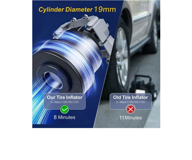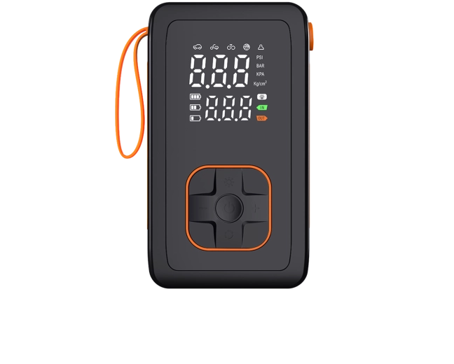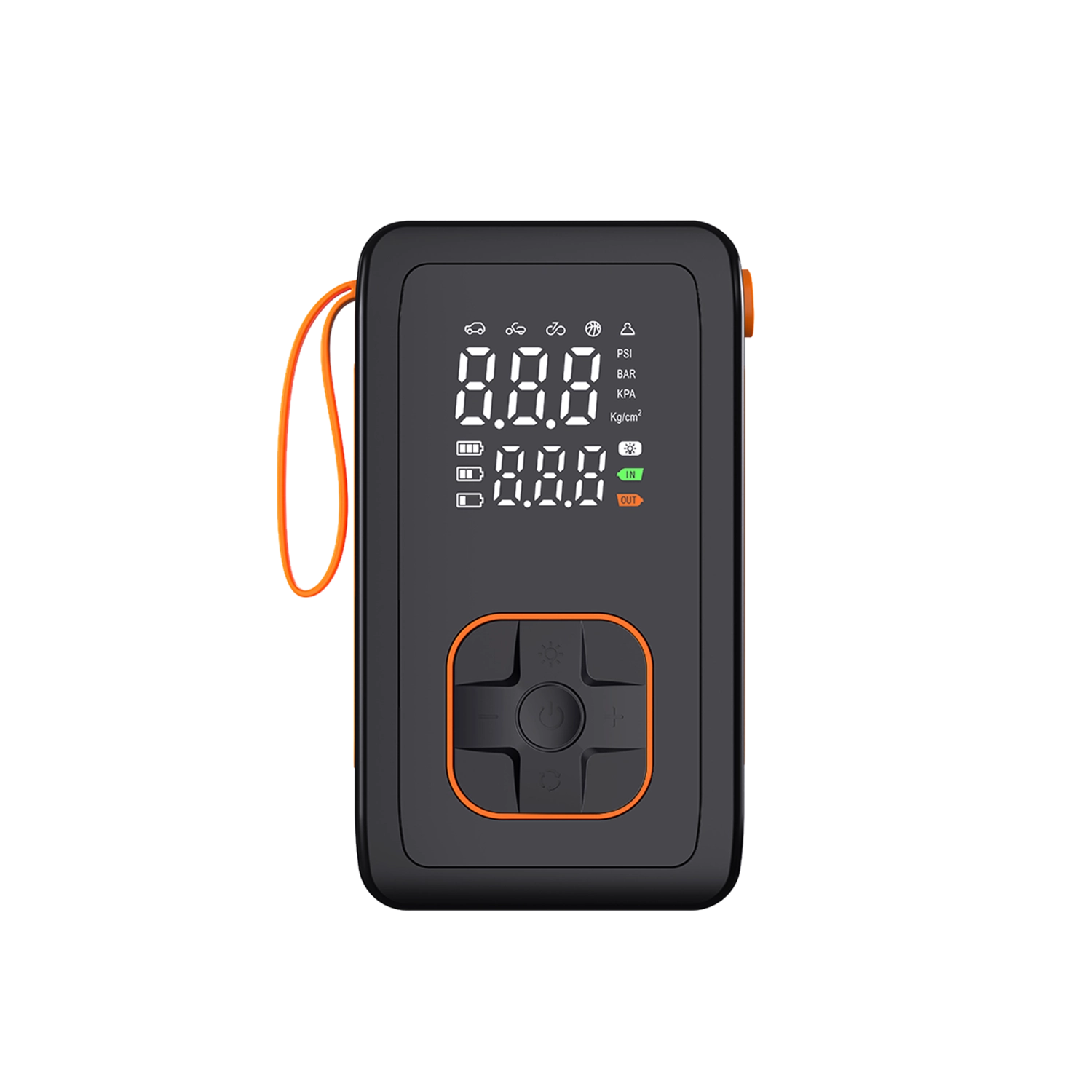 Această pompă portabilă de 7,4 V cu acumulator combină umflare performantă până la 150 PSI / 10,3 BAR cu funcția practică de powerbank. Datorită dimensiunilor compacte și mânerului comod este ideală pentru călătorii, mașină și atelier. Ecranul digital dual afișează atât valoarea setată, cât și pe cea actuală a presiunii, în timp ce oprirea automată oprește umflarea după atingerea țintei.