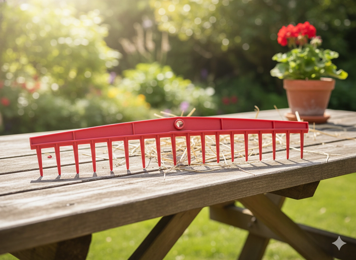 Bara dreaptă cu 16 dinți asigură strângerea eficientă a frunzelor și nivelarea precisă a solului fără efort.
