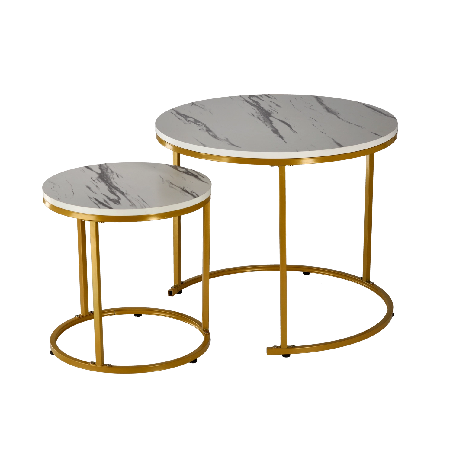 Acest set din două piese impresionează prin blatul alb cu imitație de marmură și baza elegantă aurie. Datorită posibilității inteligente de a introduce măsuța mică sub cea mare, obțineți o suprafață flexibilă pentru cafea, cărți și decorațiuni, fără a pierde spațiu prețios.