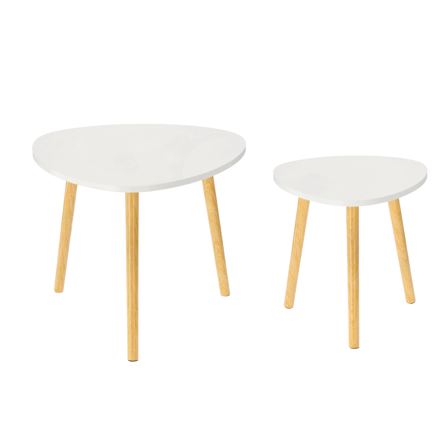 Set stilat de două măsuțe de cafea cu blat alb și picioare din lemn natural, care aduce minimalism scandinav, linii ușoare și versatilitate practică în orice interior. Forma triunghiulară neregulată/rotunjită oferă un aspect original și se potrivește în living, dormitor sau birou.