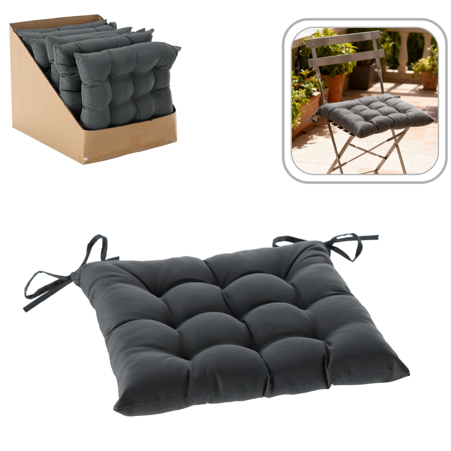 Înălțimea de 6 cm oferă o ședere plăcută și moale, chiar și la utilizare îndelungată. Perna este echipată cu 2 șireturi de prindere, care previn alunecarea. Datorită husei rezistente din 100% poliester, este potrivită pentru interior și pentru utilizare ocazională la exterior.