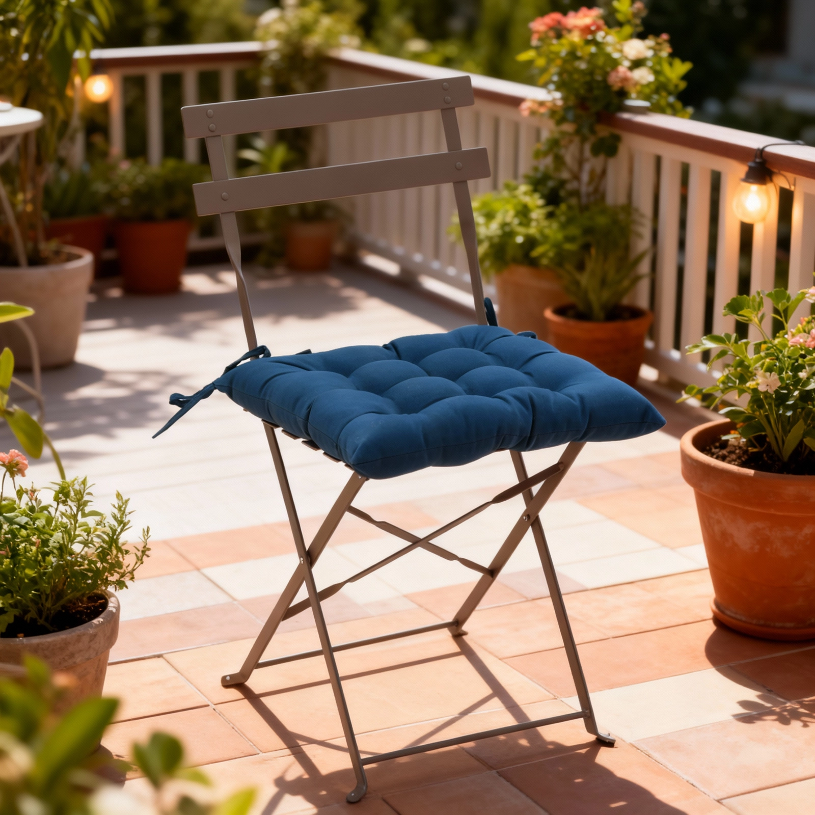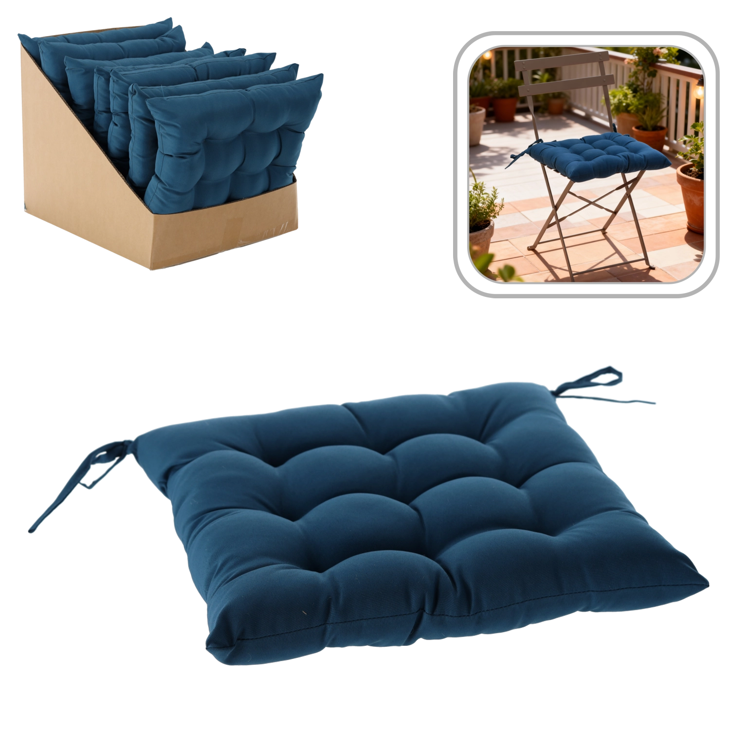 Pernă stilată pentru scaun, în nuanță de albastru, cu dimensiunile 40 × 40 × 6 cm, care oferă șederii tale mai mult confort și un aspect proaspăt. Datorită celor 9 puncte de matlasare își păstrează forma, este plăcut moale și, cu ajutorul șnururilor, o fixezi ușor de scaun acasă, pe balcon sau pe terasă.