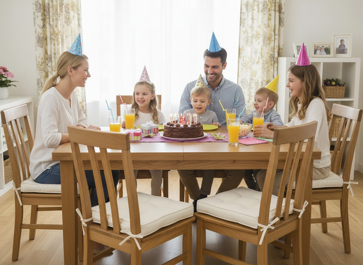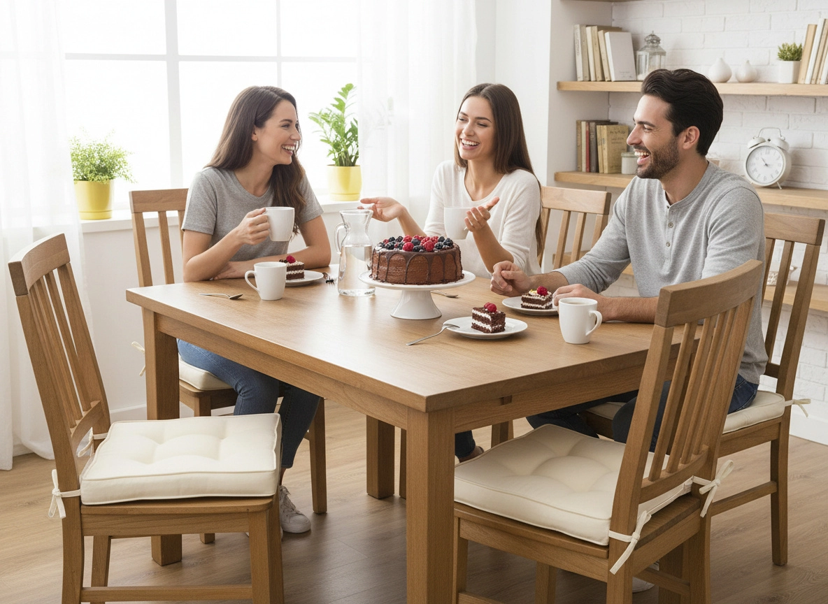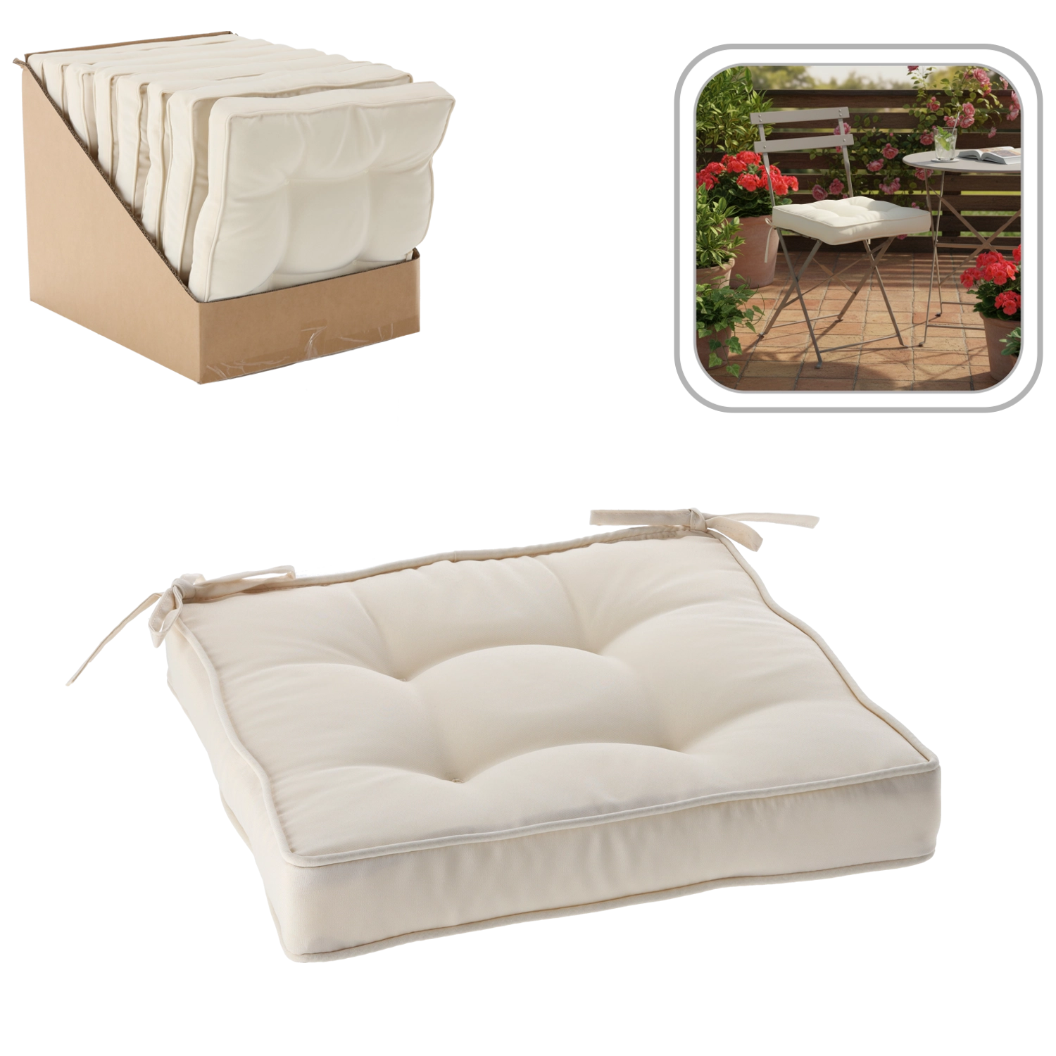 Husa din poliester rezistent se curăță ușor, iar șnururile practice fixează ferm perna de scaun. Umplutura din fibră de poliester oferă susținere stabilă și confort pentru șederi mai îndelungate la masă, la lucru sau în timpul relaxării.