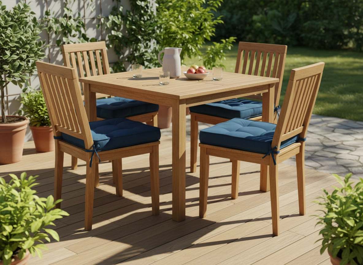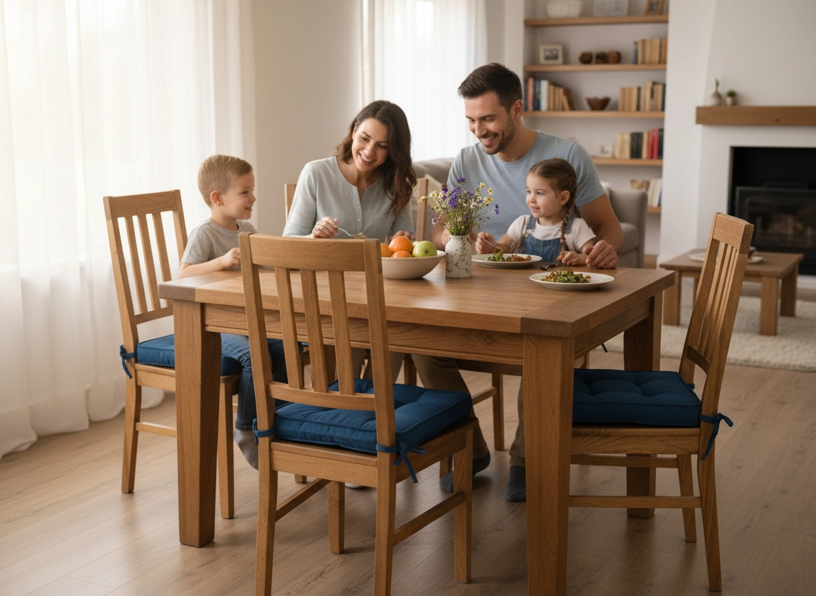 Husa durabilă din poliester și culoarea albastră atemporală se potrivesc în sufragerie, bucătărie și în zona de relaxare din grădină.