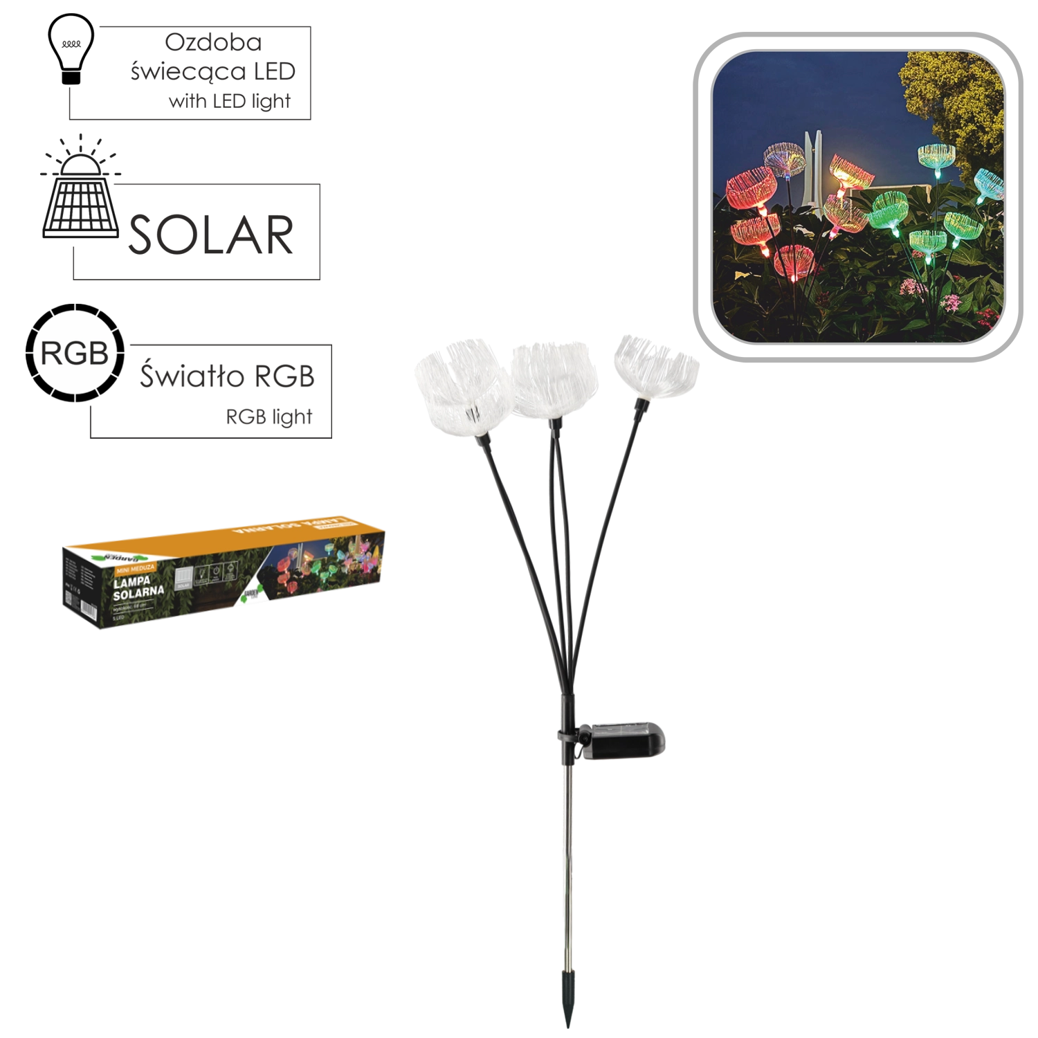 Alimentarea este asigurată de un panou solar amorf 2 V / 80 mA și o baterie Ni-MH AA 1,2 V / 200 mAh înlocuibilă. După încărcare completă, lampa luminează 6–7 ore și se aprinde automat la amurg. Construcția fără fir permite o instalare ușoară, fără cablare – trebuie doar înfiptă în sol.