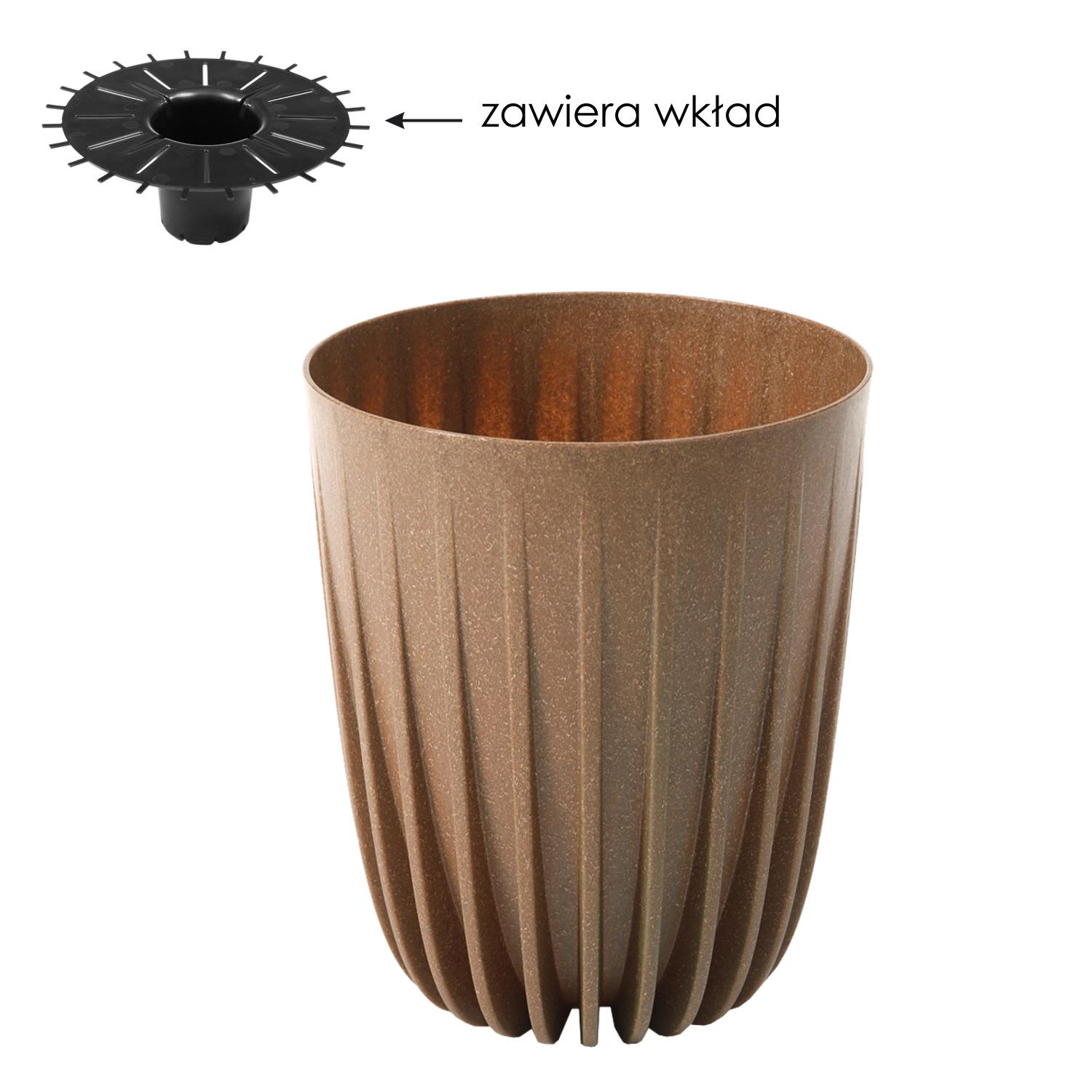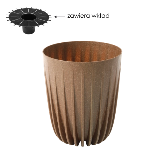 Ghiveciul elegant MIRA ECO Wood cu diametrul de 19 cm în decor de lemn natural impresionează prin modelul geometric modern și canelurile verticale. Datorită adâncimii mai mari, este ideal pentru plante cu un sistem radicular mai extins și susține creșterea sănătoasă. Polipropilena durabilă facilitează întreținerea, iar inserția cu orificii de drenaj asigură udarea optimă. Se potrivește excelent atât în interior, cât și în exterior și se armonizează cu stiluri variate – de la clasic la boho.