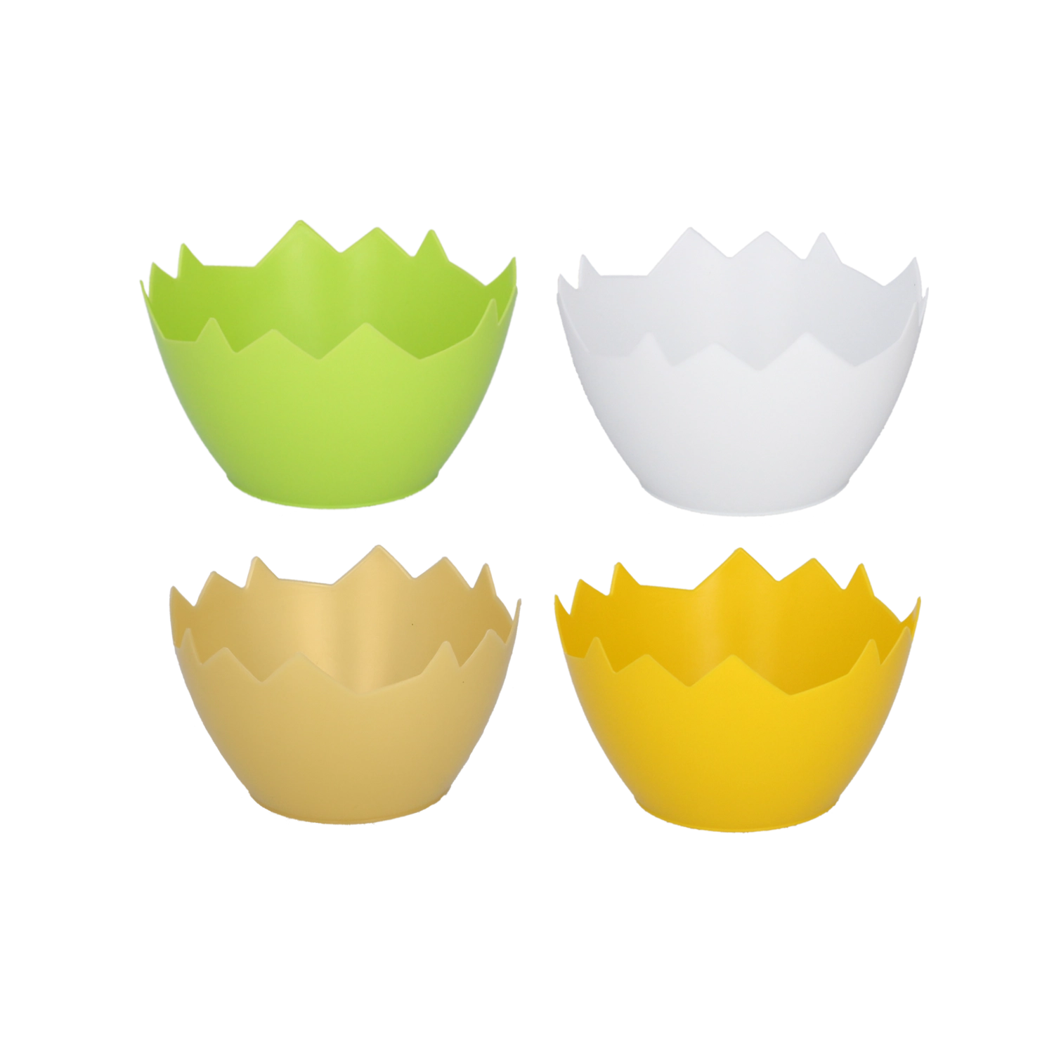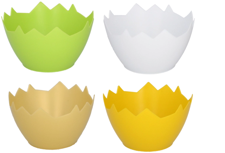 Ghiveci decorativ din plastic, cu diametrul de 12 cm, în formă de coajă de ou crăpată, care aduce casei tale o notă proaspătă de primăvară. Se remarcă prin construcție ușoară și rezistentă, întreținere facilă și utilizare versatilă pentru ierburi aromatice, creson și aranjamente de Paște. Disponibil în culori vesele pentru asortare cu interiorul.