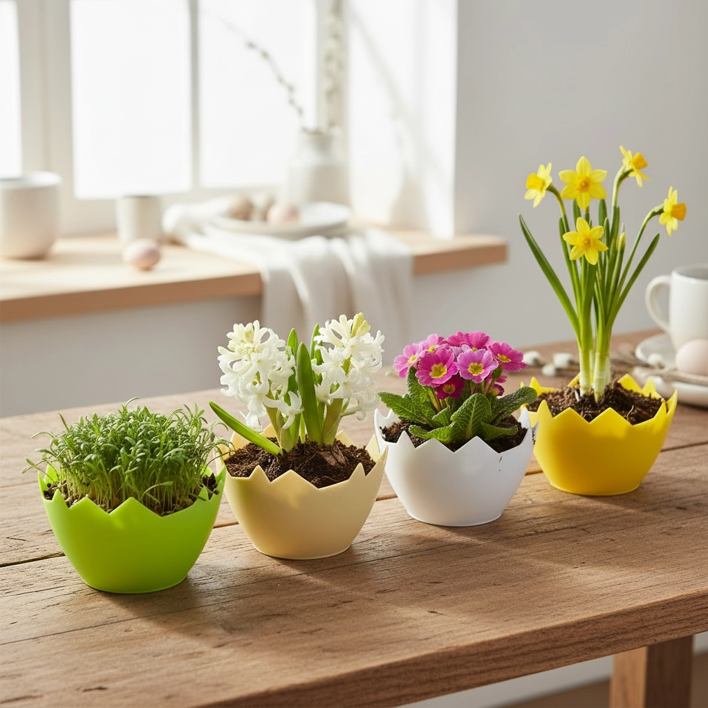Ghiveciul este perfect pentru ghivece mici, ierburi aromatice, creson și decorațiuni sezoniere de Paște. Paleta de culori în nuanțe de verde, alb, galben și bej îți permite să armonizezi decorul într-un stil unitar sau, dimpotrivă, să creezi contraste jucăușe.