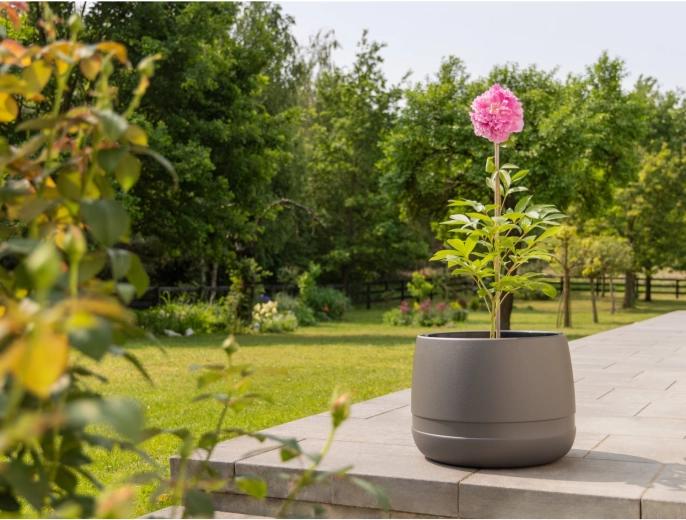Ghiveciul Lamela KOMA WAZA 35 cm, în nuanța atemporală de antracit, se potrivește perfect atât în interioare, cât și în spații exterioare moderne. Suprafața netedă și forma minimalistă evidențiază frumusețea plantelor, în timp ce polipropilena durabilă asigură o durată de viață lungă și utilizare fără griji pe balcon, terasă sau în grădină.