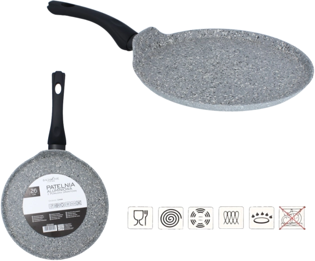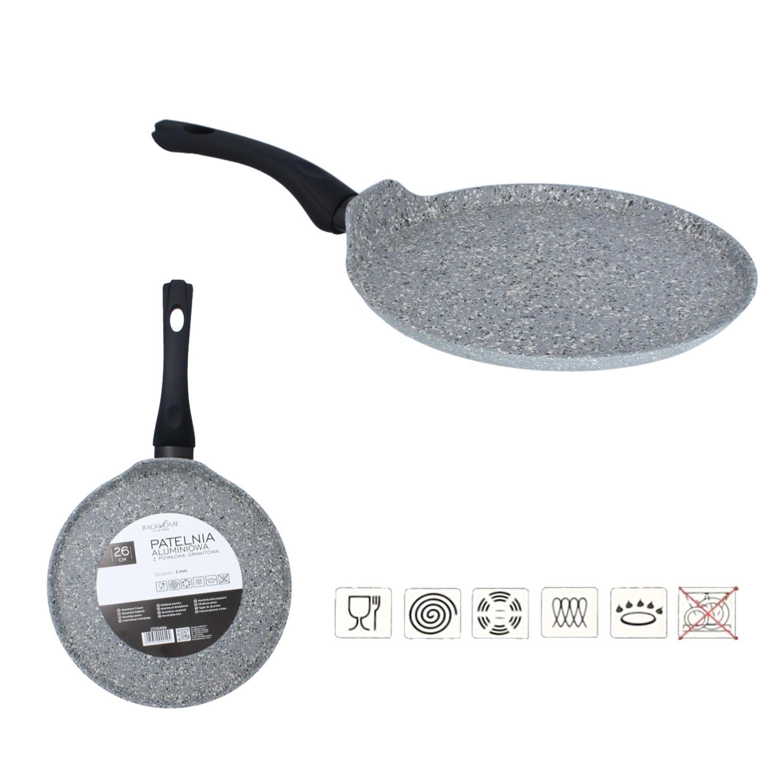 Tigaie universală pentru clătite, diametru 26 cm, din aluminiu forjat pentru distribuire rapidă și uniformă a căldurii. Datorită finisajului antiaderent tip granit la interior și exterior, se curăță ușor, rezistă la zgârieturi și permite gătit cu minimum de grăsime. Mânerul ergonomic din nailon asigură prindere sigură și manevrare confortabilă. Ideală pentru clătite subțiri, omlete și lipii.