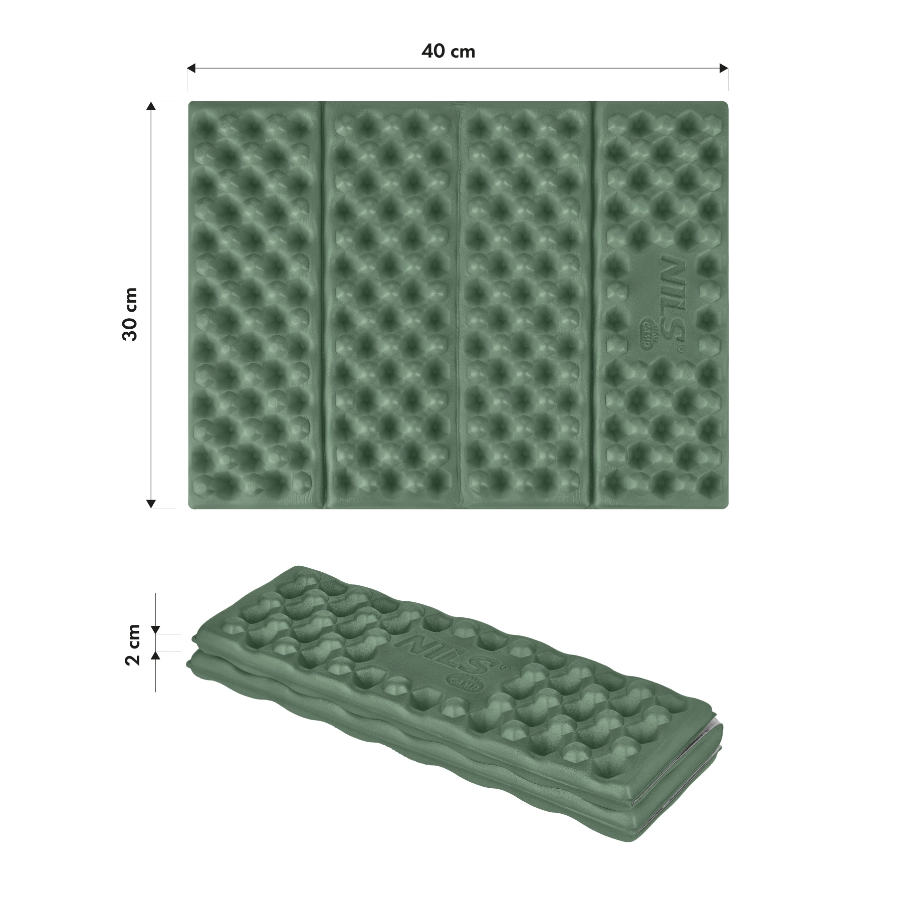 Bucură-te de o pauză confortabilă oriunde în natură. Scăunelul pliabil NILS Camp este realizat din spumă IXPE de calitate, elastică, durabilă și neabsorbantă. O față este acoperită cu folie de aluminiu pentru a reflecta eficient căldura înapoi către corp sau pentru izolare față de solul rece – în funcție de cum întorci scăunelul.