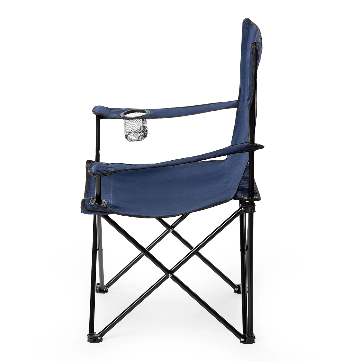 Detaliile bine gândite sporesc confortul la ședere: cotierele reglabile se adaptează ușor, iar în suportul de băuturi integrat poți așeza în siguranță o sticlă sau un pahar. Picioarele din plastic cu bază pătrată asigură stabilitate și previn afundarea pe suprafețe moi. La finalul zilei, îl pliezi rapid într-un format compact pentru transport facil.