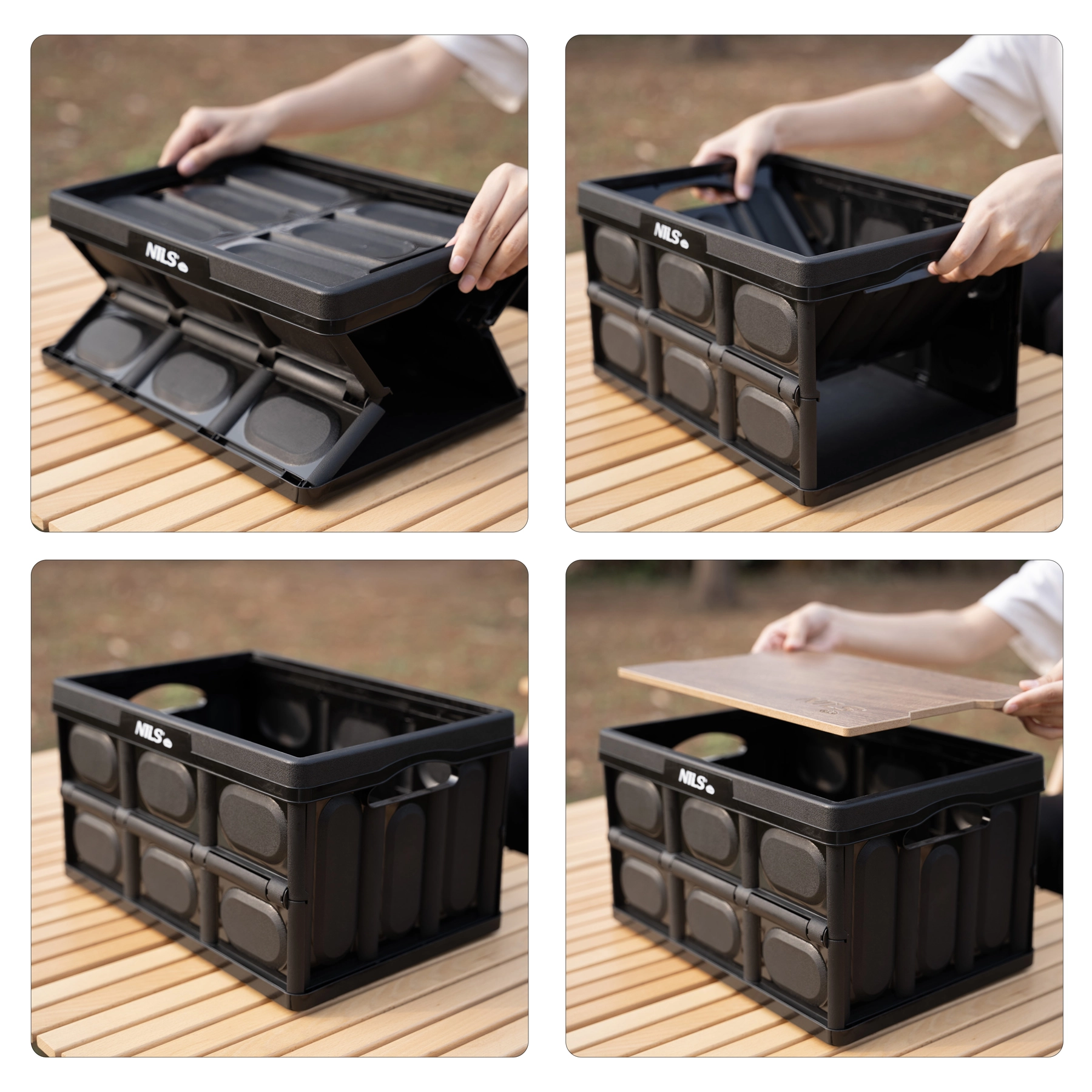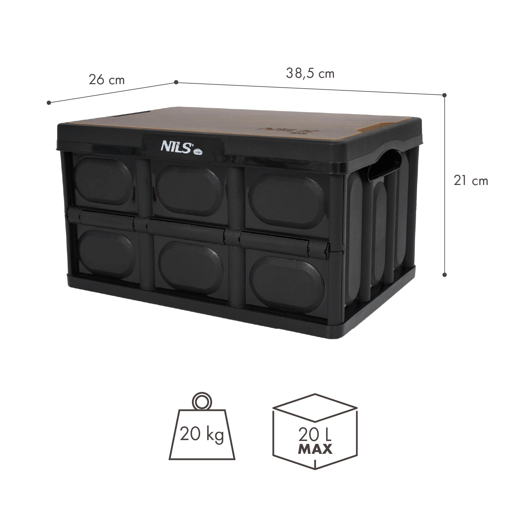 Lada pliabilă NILS Camp cu volum de 20 l și capac rezistent din lemn servește atât ca box de depozitare, cât și ca măsuță stabilă. Este ușoară, pliabilă la 5 cm, stivuibilă și fabricată din polipropilenă rezistentă, fiind ideală pentru mașină, casă, camping și atelier.