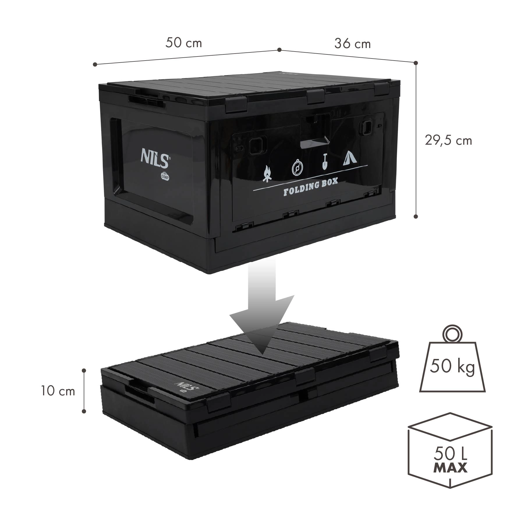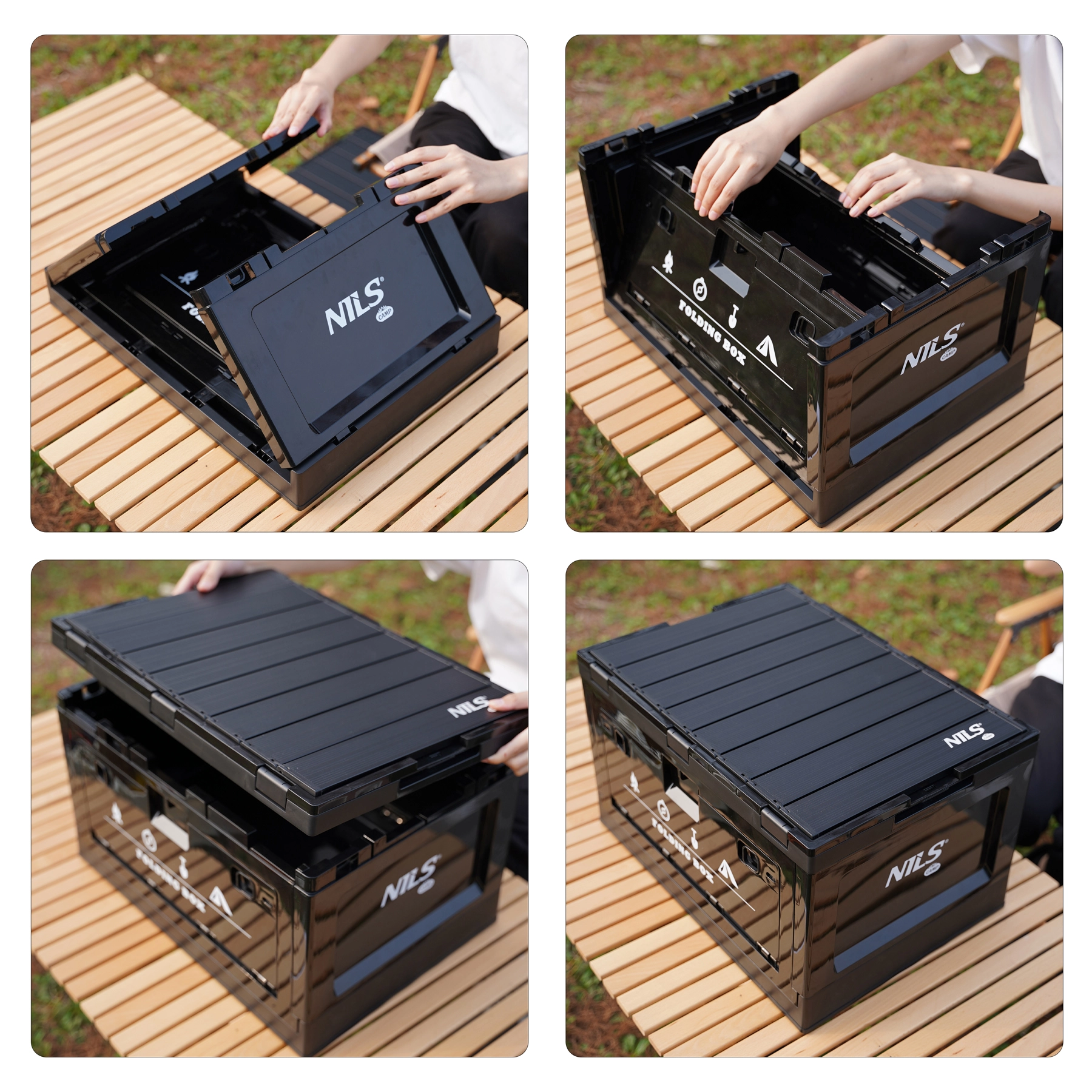 Cutia pliabilă NILS CAMP, robustă și spațioasă, îmbină depozitarea inteligentă cu funcția de suprafață de lucru. Capacul integrat servește drept măsuță stabilă pentru pregătirea meselor, lucrul cu unelte sau organizarea mărunțișurilor. Datorită polipropilenei (PP), rezistă la umiditate, solicitări mecanice și vreme schimbătoare.
