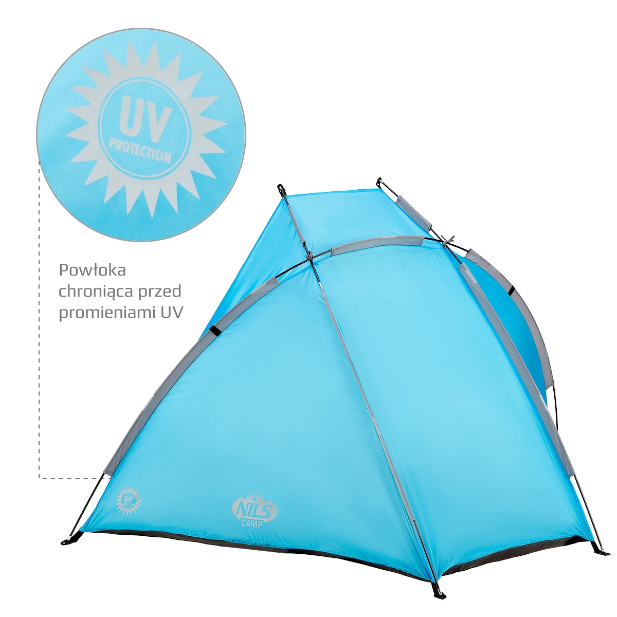 Cortul de plajă NILS Camp, ușor și compact, oferă adăpost fiabil împotriva soarelui pentru copii și adulți. Datorită protecției UV cu reflectivitate de până la 96 %, montajului simplu cu bețe din fibră de sticlă și buzunarelor practice, este ideal pentru plajă, ștrand sau grădină. Oferă asamblare rapidă, protecție împotriva vântului cu țăruși incluși și material rezistent chiar și la averse ușoare.