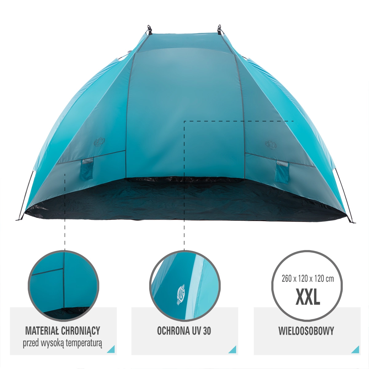 Bucurați-vă de confort și umbră pe plajă cu cortul spațios NILS Camp, mărimea XXL. Oferă protecție împotriva radiațiilor UV, are folie de sol impermeabilă și, datorită asamblării rapide și ușoare, este ideal pentru familii. Construcția ușoară, stabilitatea cu țăruși și dimensiunile compacte după pliere facilitează transportul și depozitarea.