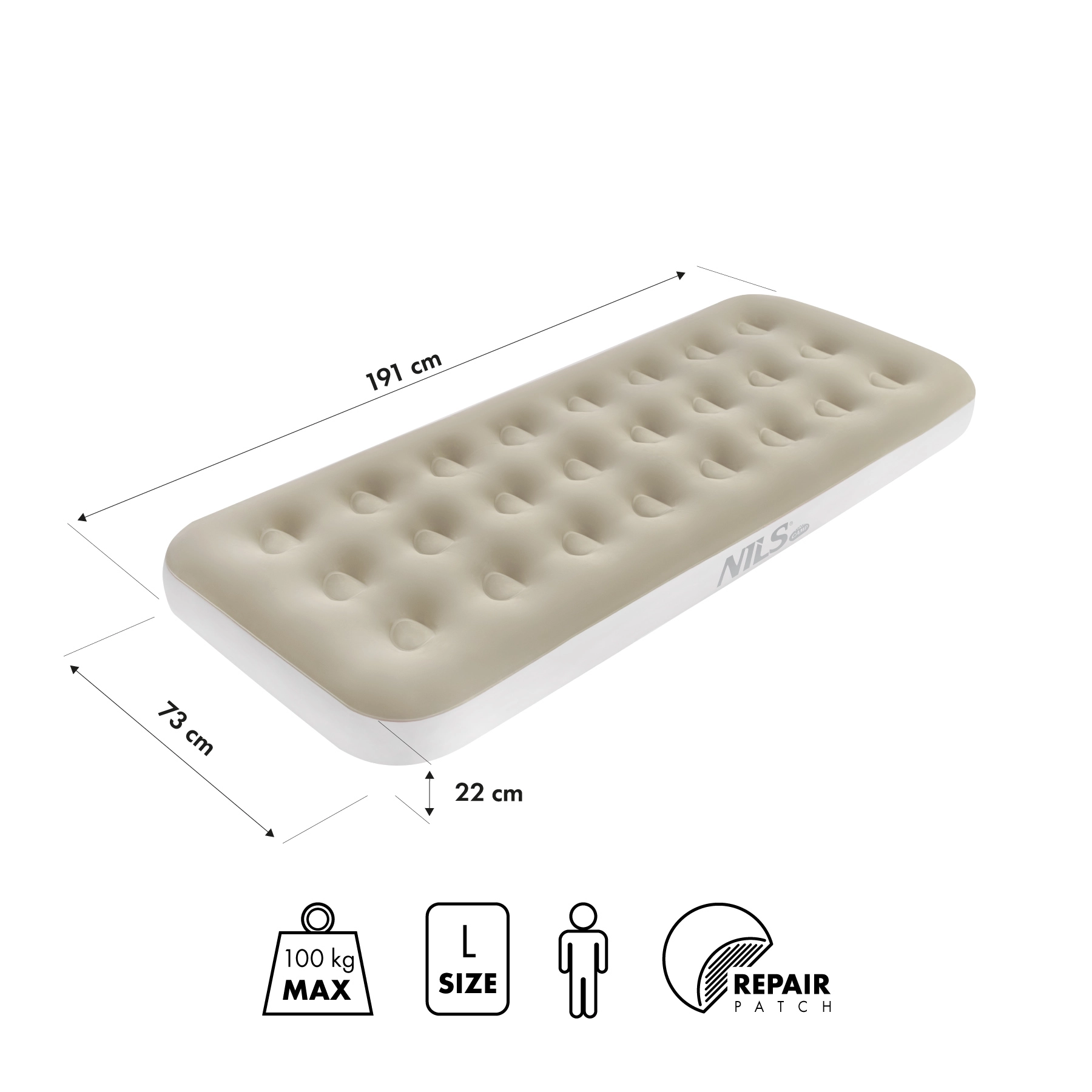Salteaua gonflabilă NILS Camp, în culoare bej, este ideală pentru acasă și pentru camping. Oferă somn confortabil, PVC rezistent, suprafață anti-alunecare și valvă dublă pentru o umflare rapidă. Datorită dimensiunilor de 191 × 73 × 22 cm și a capacității de încărcare de 120 kg, asigură sprijin stabil și o excelentă izolație față de sol.