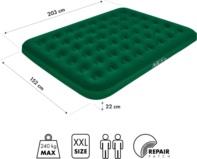 Salteaua gonflabilă NILS Camp oferă dimensiuni de 203 × 152 × 22 cm pentru un somn confortabil acasă și în călătorii. Datorită PVC-ului rezistent, capacității mari de încărcare de 240 kg și înălțimii de 22 cm, izolează excelent de frig și denivelări. Valva dublă permite umflare și dezumflare rapidă cu gura sau cu pompă manuală, cu piciorul sau electrică.