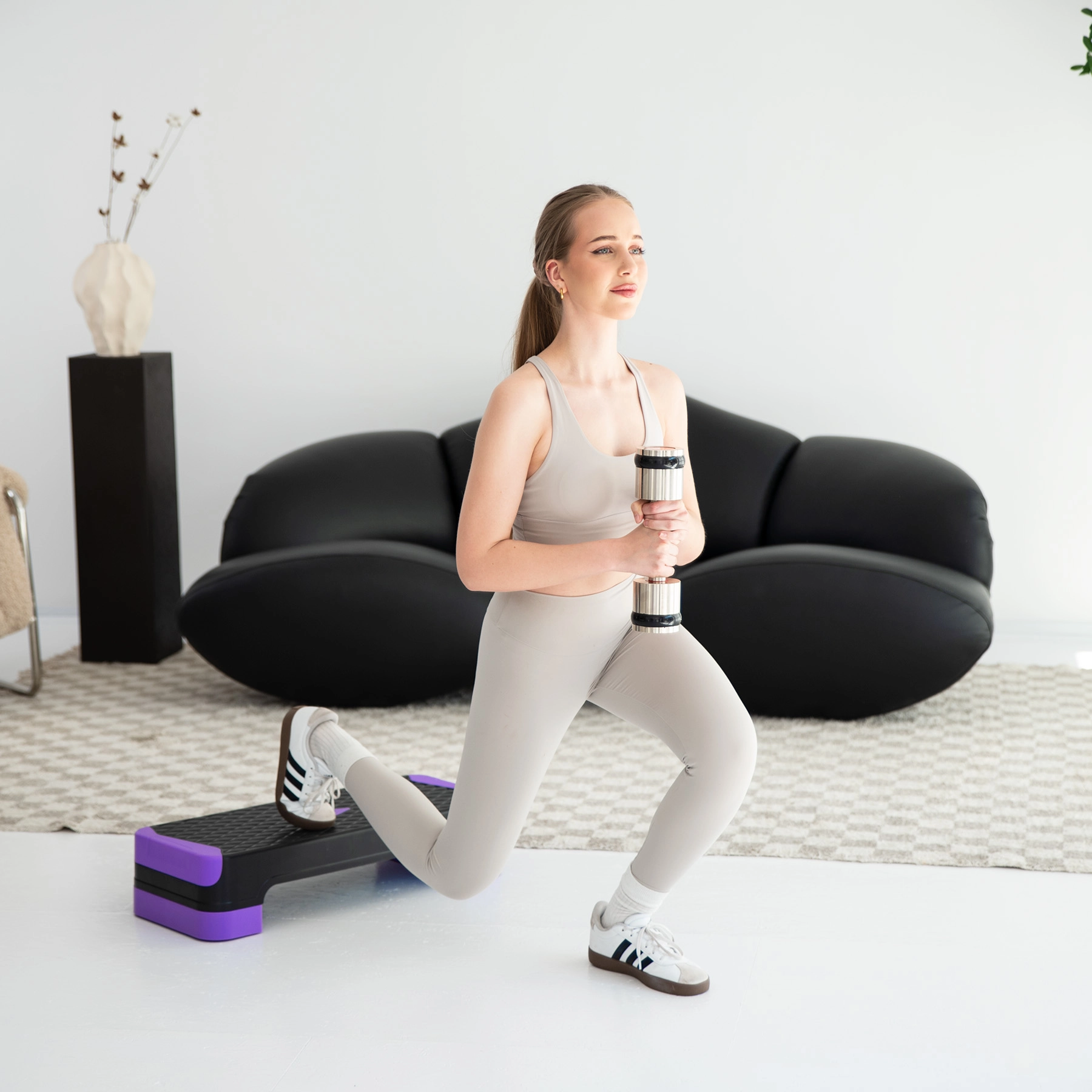 Suprafața antiderapantă și construcția robustă oferă siguranță la step, fandări și exerciții cu gantere în mediul de acasă.