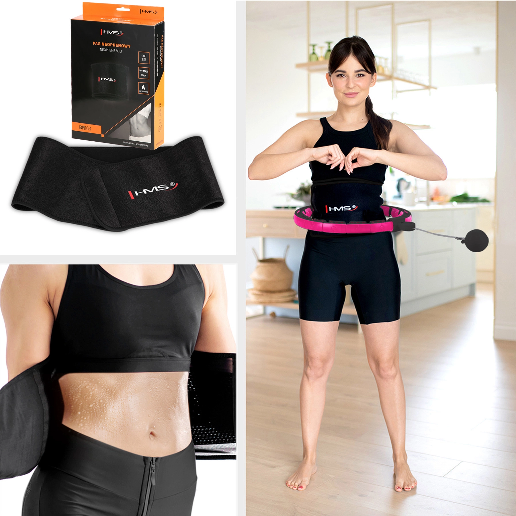 În pachet este inclus și brâul modelator HMS BR163 din neopren, care ridică temperatura în zona abdomenului, favorizează transpirația și ajută la conturarea taliei. Datorită materialului elastic și închiderii cu arici, se potrivește excelent atât bărbaților, cât și femeilor, la antrenament și pe parcursul zilei.