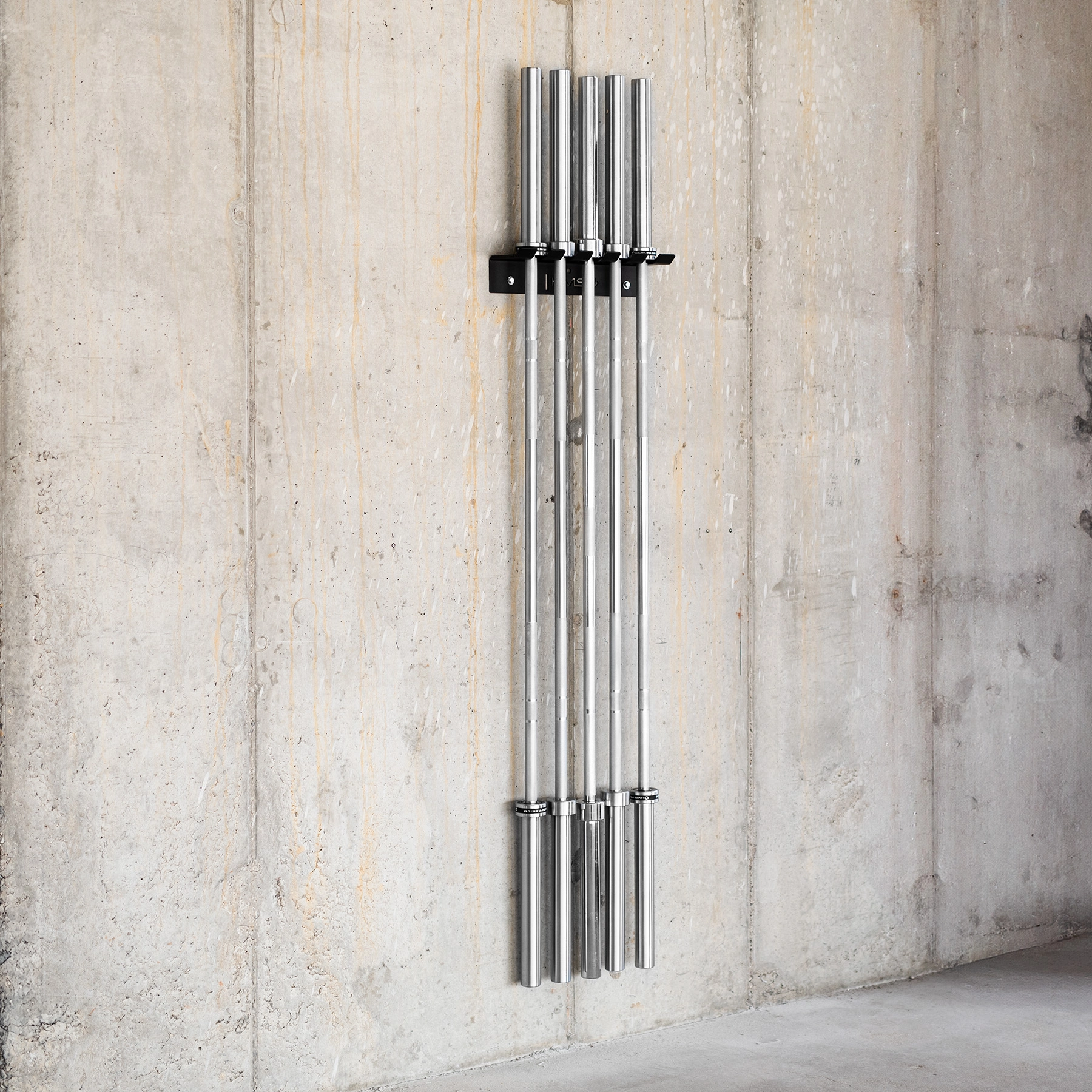 Depozitarea verticală a până la 5 bare olimpice, una lângă alta, eliberează spațiul valoros de pe podea și menține sala de antrenament ordonată.