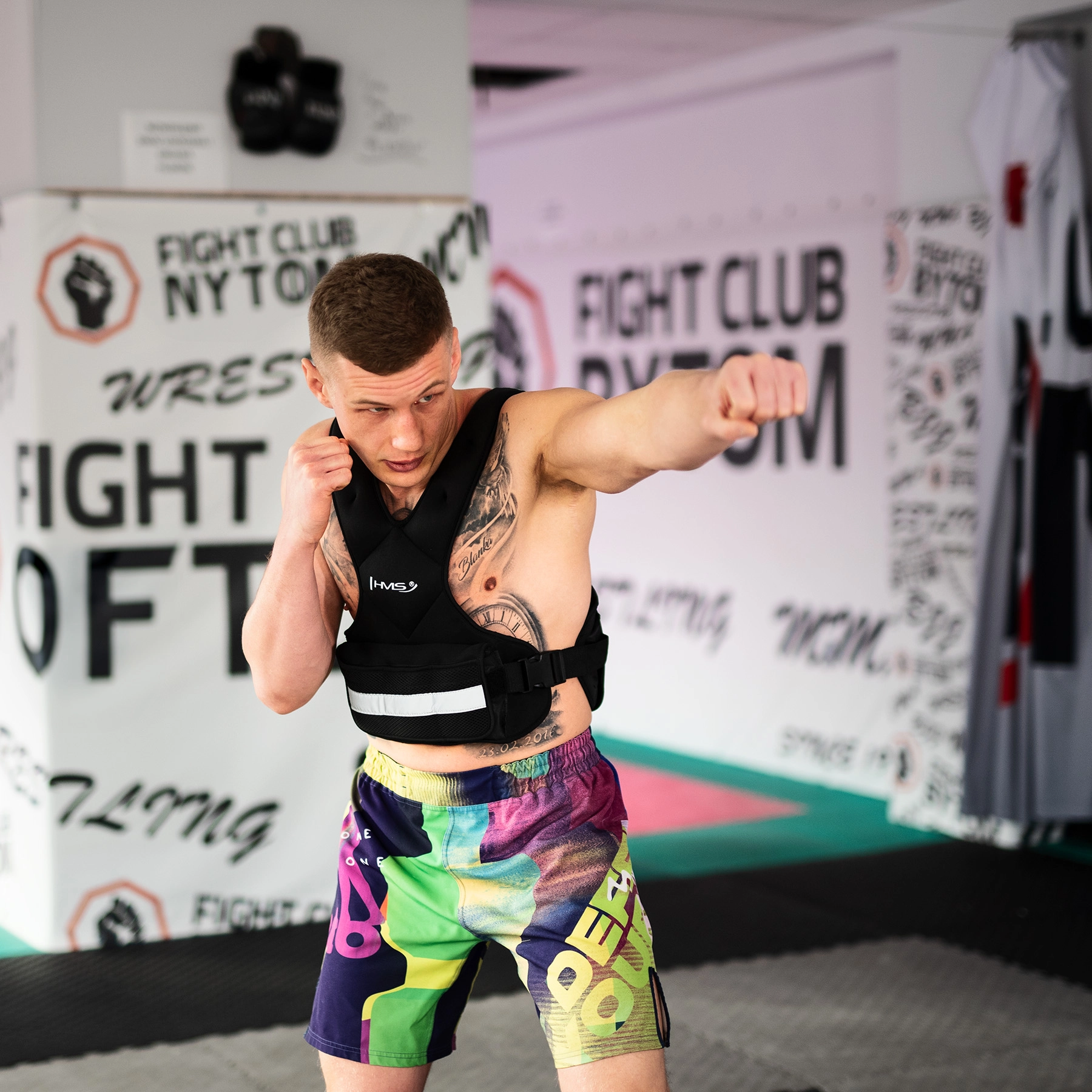 Vesta cu greutăți HMS KOR a fost concepută pentru întărirea eficientă a corpului și îmbunătățirea rezistenței. Cele șase inserturi detașabile cu nisip de fier permit reglarea lină a încărcării până la 9 kg, iar distribuția uniformă pe întreaga suprafață a vestei protejează spatele și umerii. Croiala ergonomică asigură libertate de mișcare în exerciții dinamice, alergare și antrenamente funcționale.