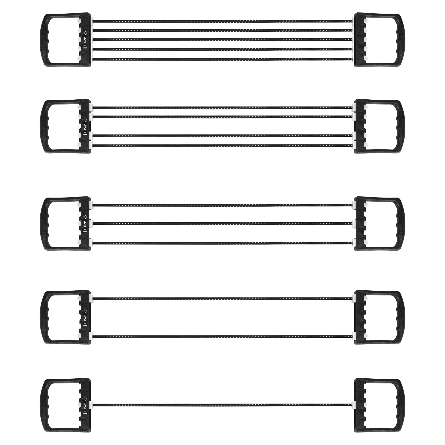 Extensor elastic universal HMS cu cinci corzi interschimbabile pentru antrenarea părții superioare a corpului. Datorită posibilității de a îndepărta sau adăuga corzi, ajustați cu ușurință rezistența variabilă pentru întărirea brațelor, spatelui și pieptului, dar și pentru exerciții de reabilitare. Mânerele ergonomice antiderapante din plastic durabil asigură priză sigură și confort atât acasă, cât și în deplasare.