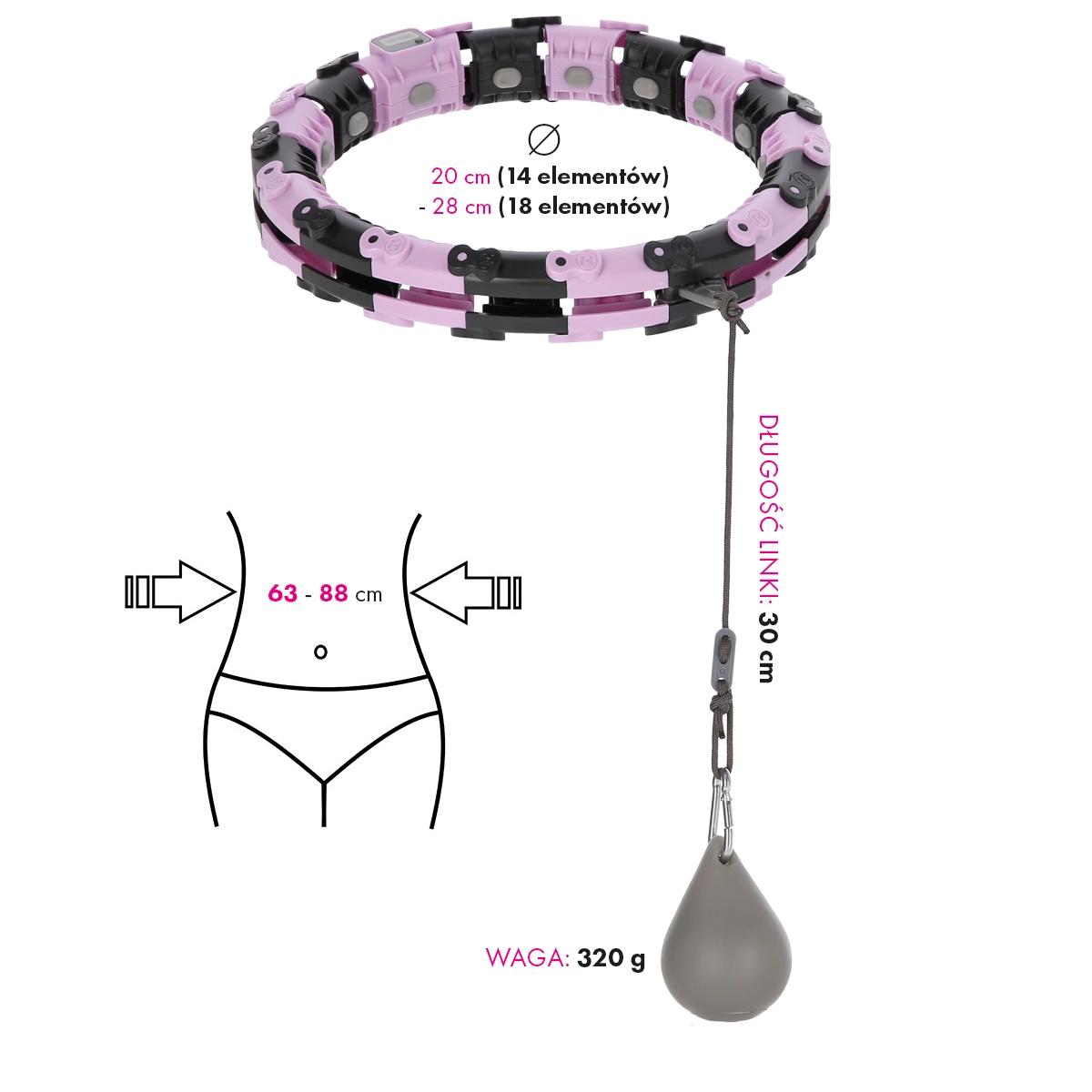 Acest cerc de fitness modern este alcătuit din segmente modulare pe care le conectați ușor în funcție de circumferința taliei. Datorită șnurului reglabil cu greutate (320 g), ajustați ușor intensitatea antrenamentului – cu cât șnurul este mai lung, cu atât forța centrifugă și dificultatea sunt mai mari. Proeminențele de masaj din interiorul cercului amortizează vibrațiile și, totodată, oferă un masaj plăcut.