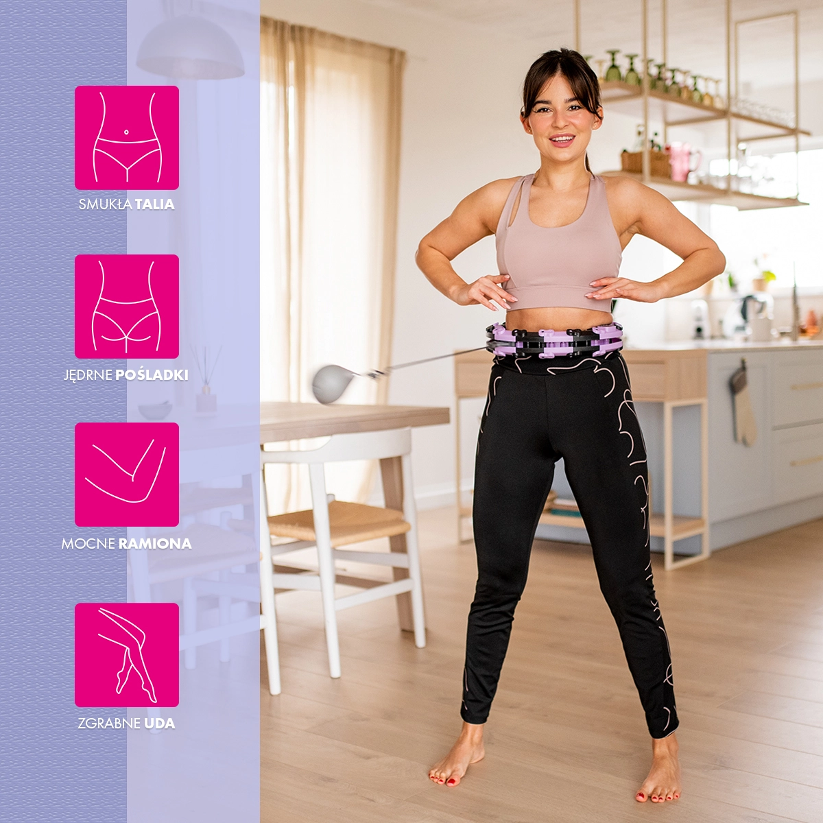 Construcția modulară din 18 segmente permite ajustarea rapidă a cercului la talia dvs. (63–88 cm). Se asamblează ușor și rămâne stabil în timpul antrenamentului.