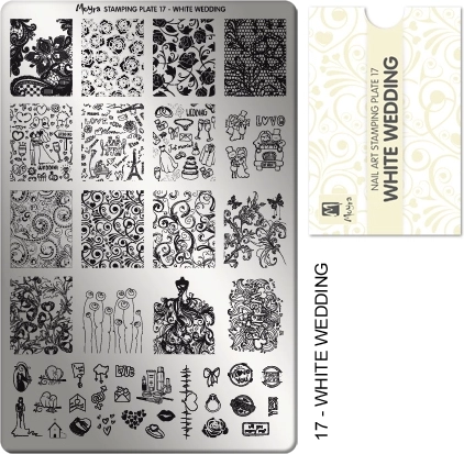 Descoperă farmecul unei manichiuri perfecte cu tematică de nuntă datorită plăcii Moyra 17 Wedding. Paleta largă de motive romantice – dantelă fină, flori, inimioare și inscripții – te ajută să creezi un design precis și uniform pe fiecare unghie fără a desena.