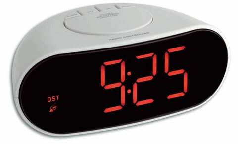 Ceas deșteptător digital practic TFA cu oră exactă controlată DCF-77, oferă cifre LED roșii mari, două niveluri de luminozitate și afișaj clar al datei și al zilei săptămânii. Dispune de alarmă repetată (snooze 4 min), opțiune de format 12/24h și setare manuală a fusului orar. În pachet sunt incluse adaptor de rețea și baterii de rezervă pentru menținerea orei în caz de pană de curent.