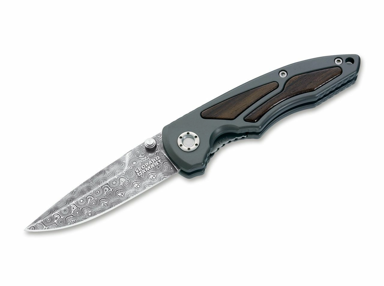 Cuțit de colecție exclusiv BÖKER MANUFAKTUR SOLINGEN Leopard-Damast I cu lamă din oțel Damasc cu 300 de straturi, forjată din oțelul tancului Leopard I. Oferă deschidere manuală cu pini pentru degetul mare, mecanism de blocare Linerlock fiabil și mâner premium din aluminiu anodizat cu inserții din lemn Ziricote. Include cutie cadou, certificat de autenticitate și număr de serie individual.
