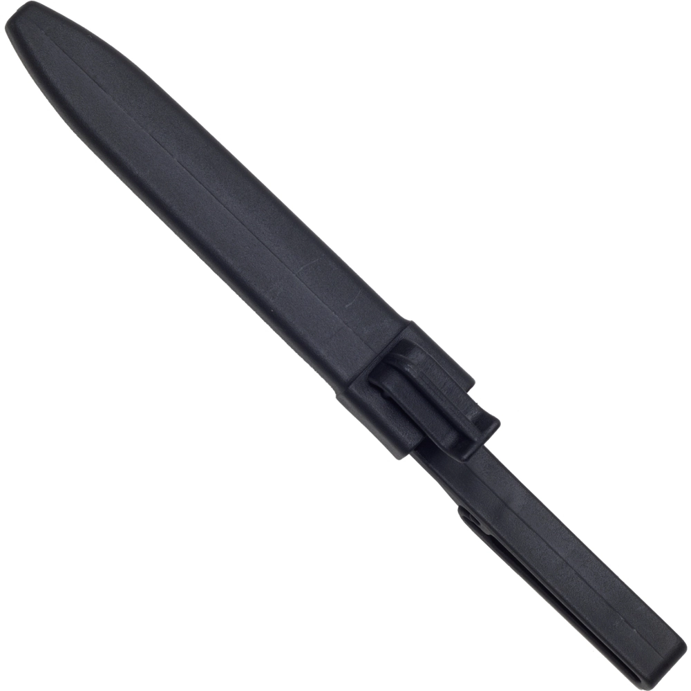 Mânerul din polimer rezistent este ergonomic, cu caneluri antiderapante, pentru o prindere fermă și confortabilă chiar și cu mănuși. Garda protejează mâna împotriva alunecării pe lamă, iar orificiul pentru șnur permite asigurarea sau agățarea. Livrat cu o teacă din plastic, ușoară și robustă, pentru purtare în siguranță.