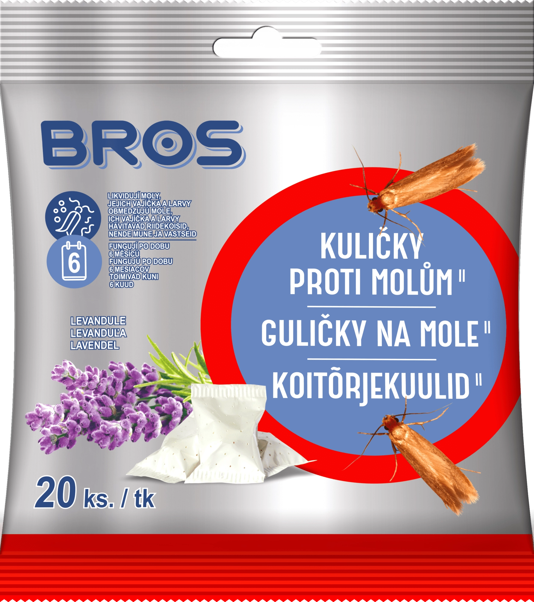 Păstrați-vă dulapul proaspăt și fără molii. Bilele verificate BROS, cu parfum de lavandă, resping eficient moliile de haine și în același timp parfumează rufele depozitate. Datorită efectului de lungă durată, până la 6 luni, reprezintă o soluție comodă și economică pentru protecția textilelor.