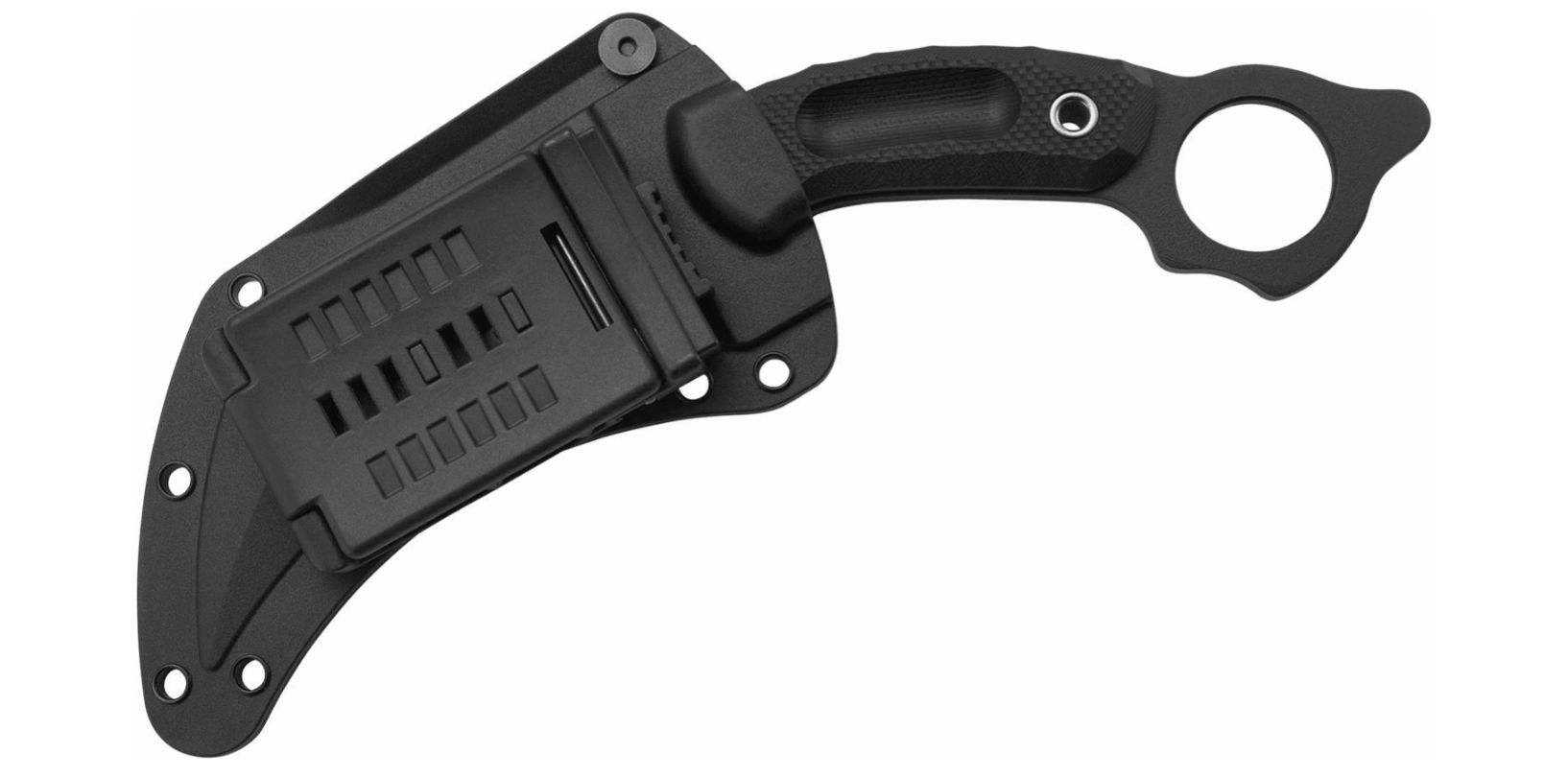 Construcția completă full-tang, împreună cu plăsele rezistente din G10, oferă o prindere fermă și sigură. Orificiul inelar mare din capătul mânerului îmbunătățește retenția și manevrabilitatea la schimbările de priză tactică. Pachetul include o teacă din GRN ușoară și robustă pentru depozitare sigură și scoatere rapidă.