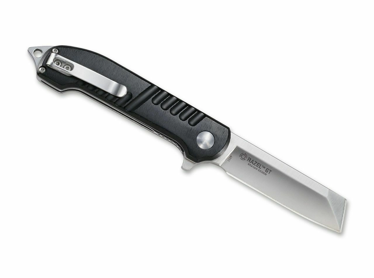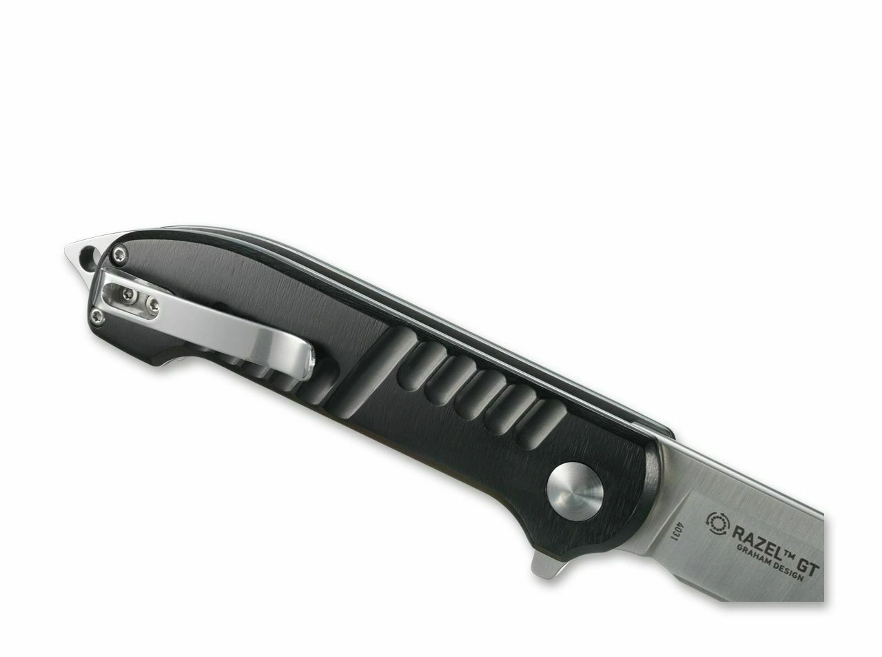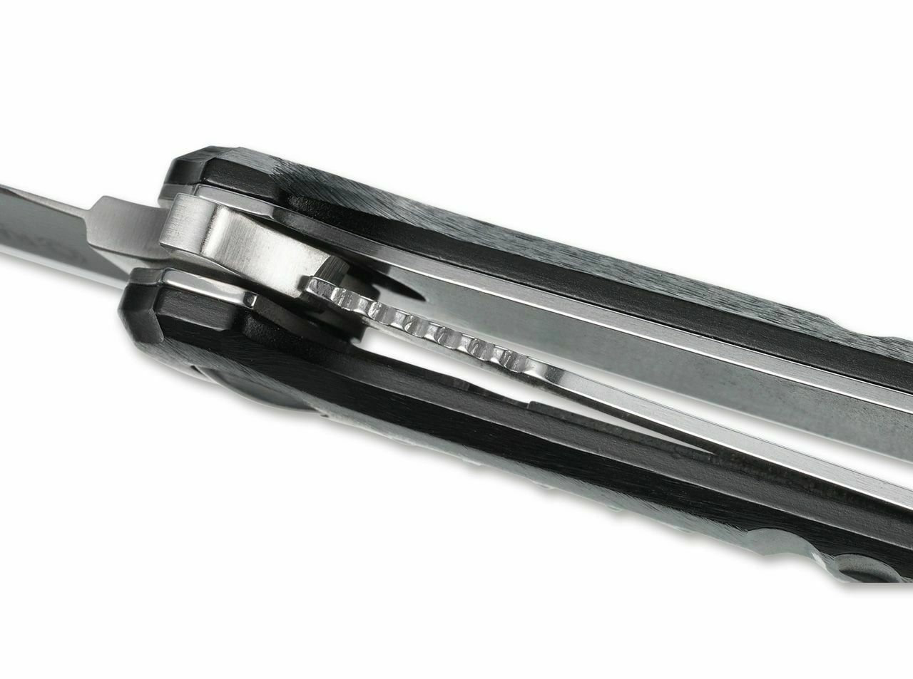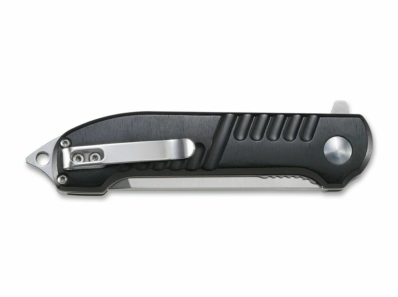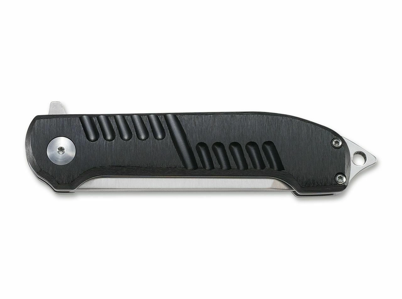 Deschiderea are loc cu ajutorul flipper-ului asistat, iar rulmenții IKBS asigură o mișcare lină și sprintenă. Siguranța la lucru este sporită de mecanismul linerlock de încredere. Mânerul din aluminiu eloxat negru, texturat se potrivește excelent în mână și este completat de clemă pentru purtare în buzunar, orificiu pentru șnur și vârf pentru spargerea de urgență a geamului.