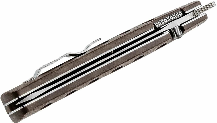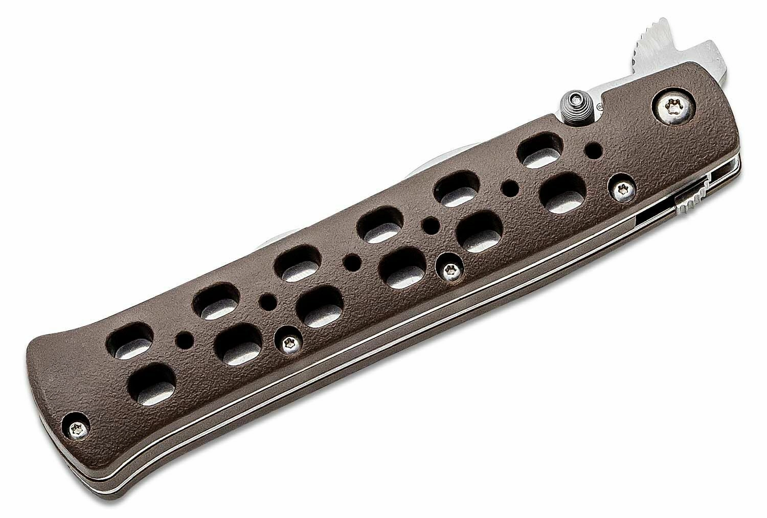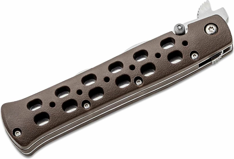 Lama din oțel inoxidabil japonez AUS-10A cu finisaj satinat oferă un compromis excelent între ascuțime, tenacitate și rezistență la coroziune. Structura asigură un mecanism de blocare pe arc Cold Steel cu rezistență declarată de aproximativ 66 kg, astfel încât vă puteți baza pe siguranță în sarcini solicitante. Mânerul ergonomic maro din Zy-Ex este ușor, robust și plăcut texturat pentru o priză sigură.