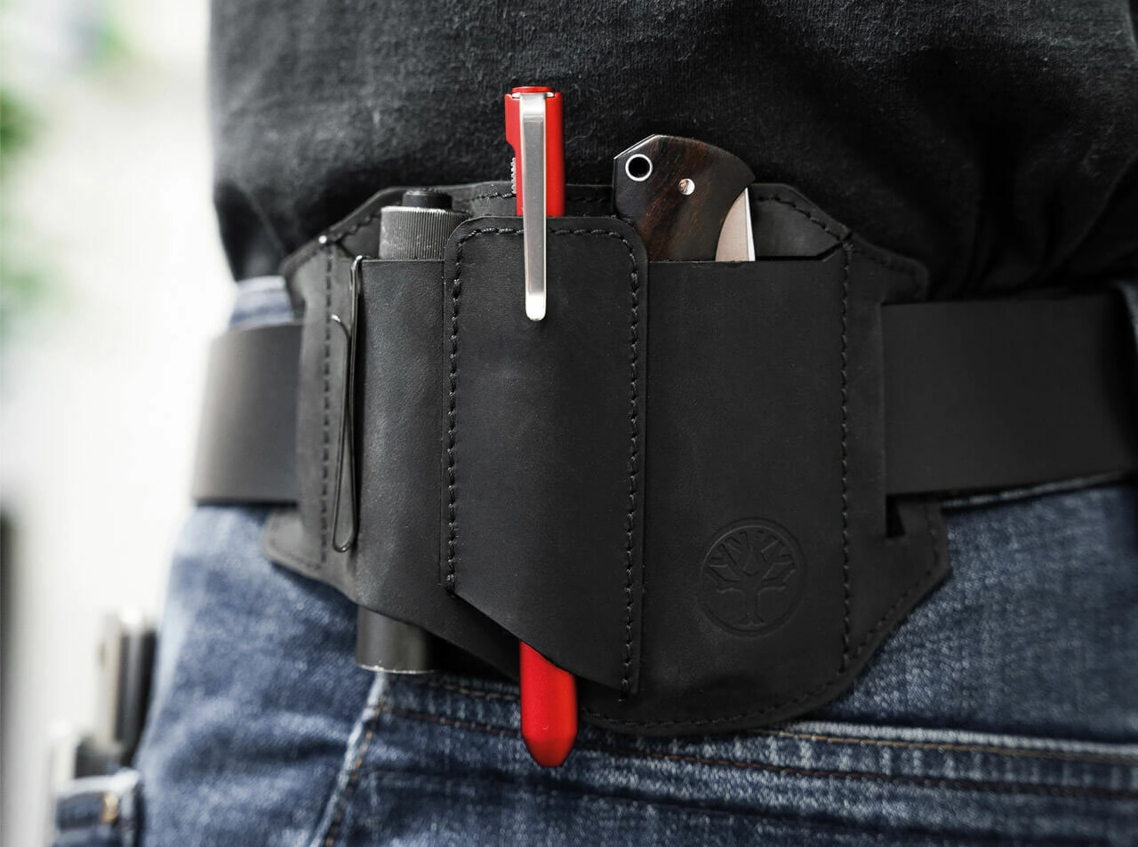 O husă stilată pentru pasionații de EDC, care îmbină funcționalitatea cu finisajul premium al mărcii BÖKER. Buzunarul principal, de dimensiuni mari, găzduiește un briceag cu mâner de până la 10 cm, iar alte două compartimente deschise în partea de jos sunt ideale pentru lanternă și stilou. Pielea nubuc este plăcută la atingere, rezistentă și în timp capătă o patină unică.