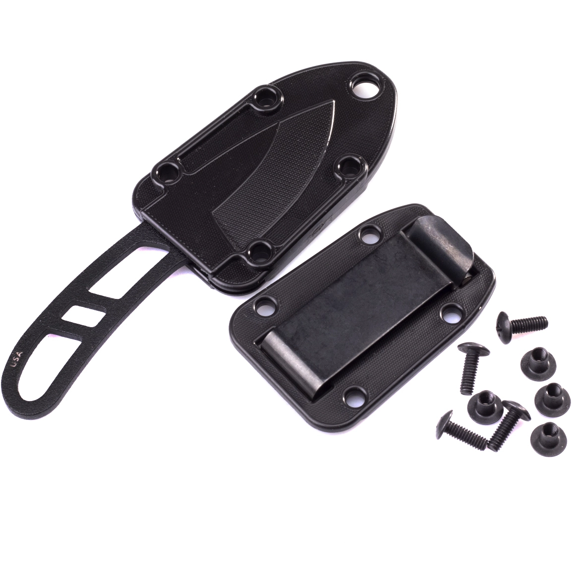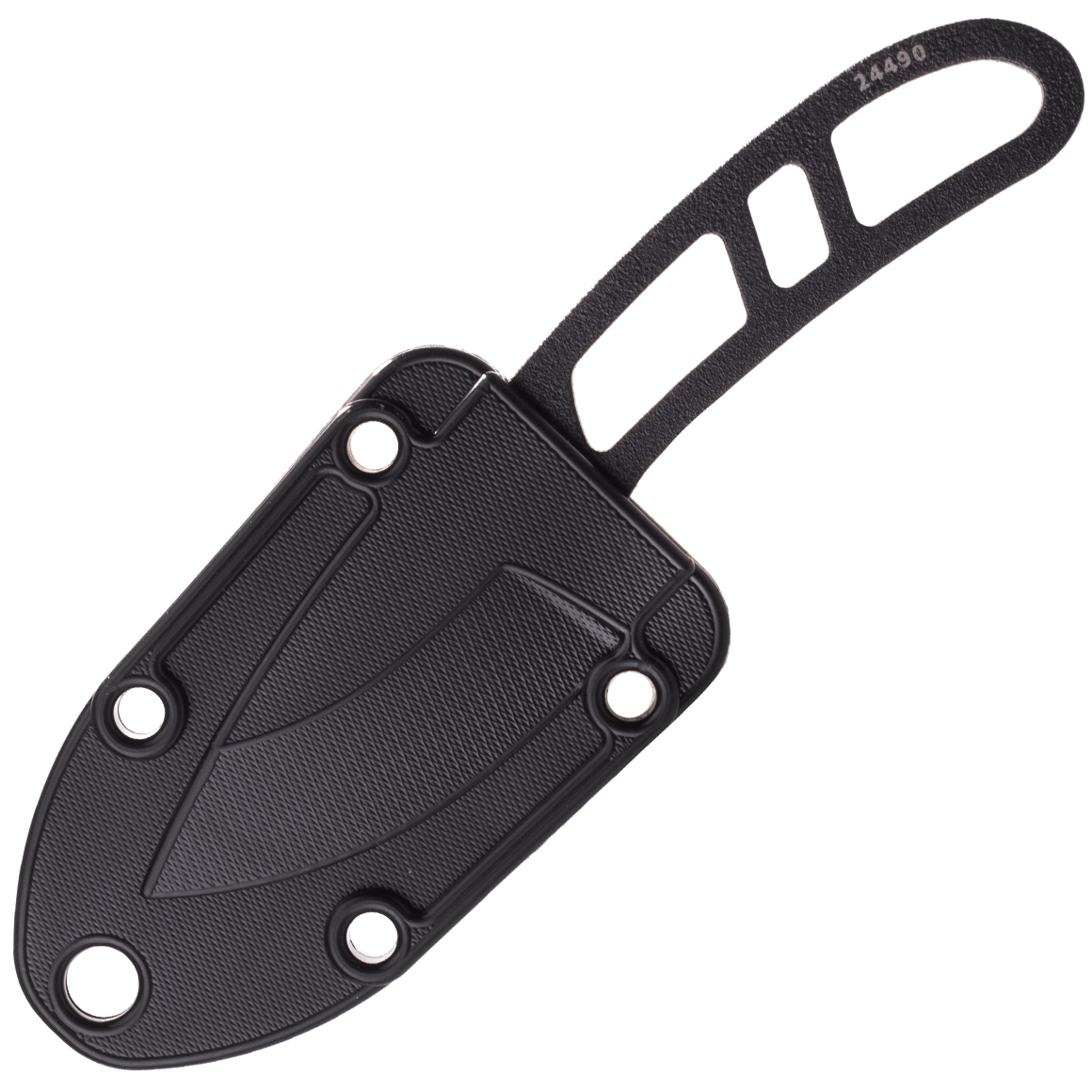 Teaca modelată, cu multiple orificii, permite agățarea pe șnur, montarea la curea sau prinderea pe rucsac. Fixează în siguranță cuțitul și protejează tăișul la transport.