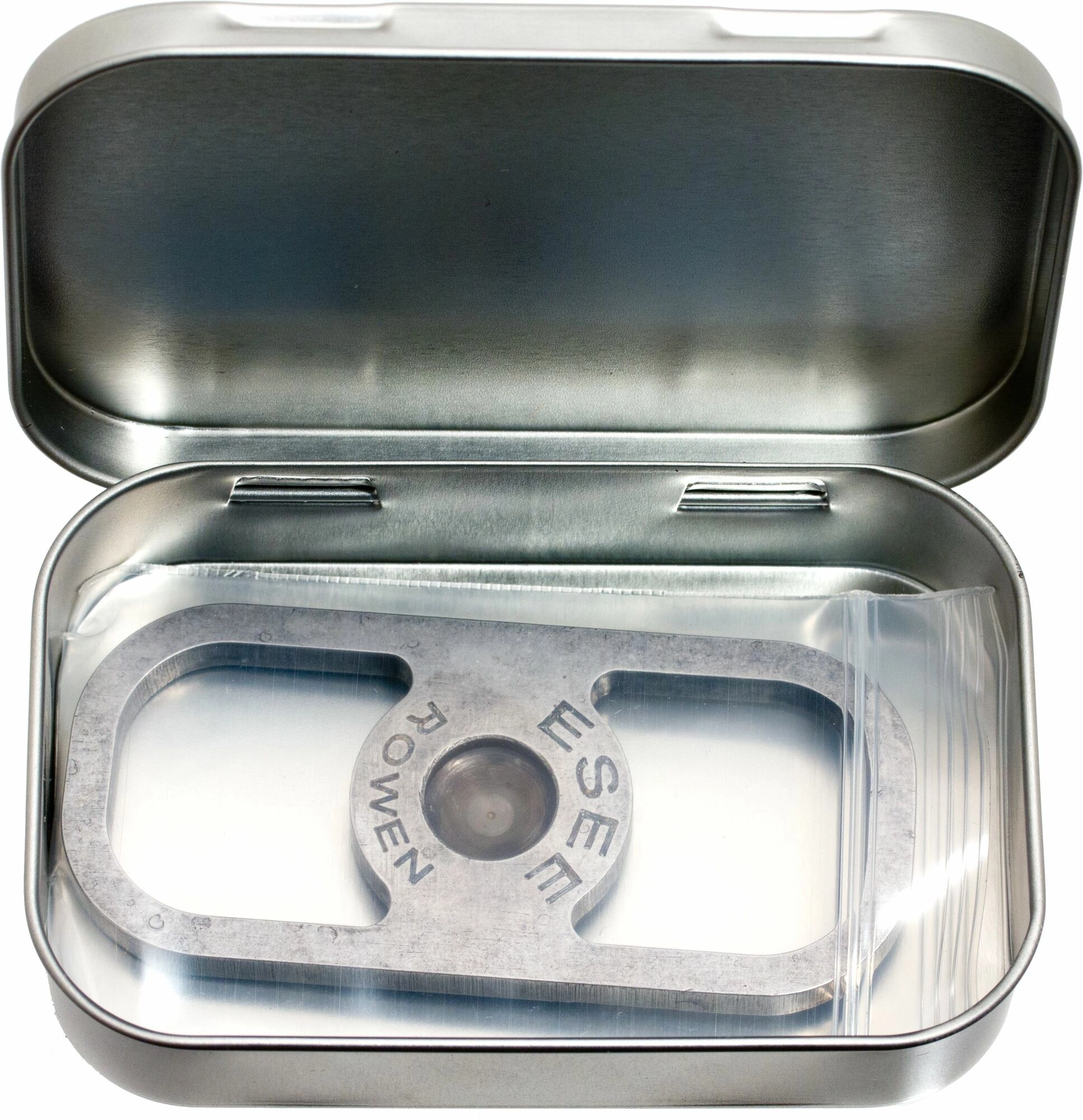 Forma bine gândită adaugă mai multe funcții într-una singură: marginile ascuțite servesc drept percutor eficient pentru tija de ferroceriu, iar vârful central poate fi folosit ca pivot pentru burghiul cu arc. Cutia metalică livrată, cu capac rabatabil, este perfectă pentru producerea pânzei carbonizate (char cloth) și pentru depozitarea în siguranță a micilor materiale de aprindere.
