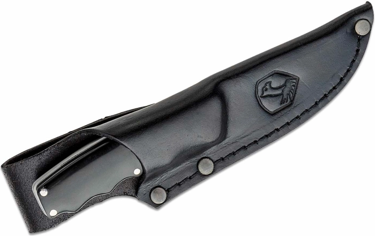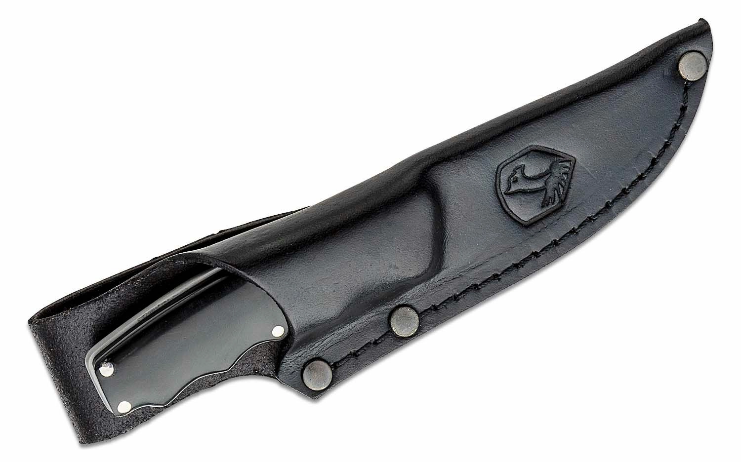 Mânerul din compozit durabil G10, în culoare neagră, oferă o prindere sigură și confortabilă chiar și cu mănuși sau pe timp umed. Pachetul include un toc din piele de calitate pentru purtare sigură și stilată la curea.